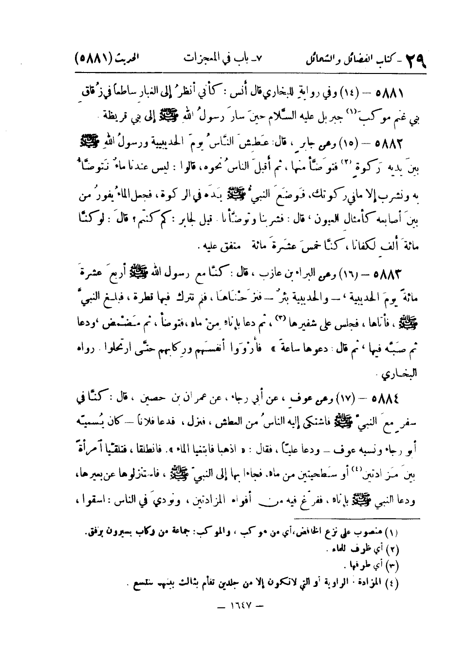 الْبَراء بن عَازِب قا ل: كُنَّا مَعَ رَسُولِ اللَّهِ صَلَّى اللَّهُ عَلَيْهِ وَسَلَّمَ أَرْبَعَ عَشْرَةَ مِائَةً يَوْمَ الْحُدَيْبِيَةِ وَالْحُدَيْبِيَةُ بِئْرٌ فَنَزَحْنَاهَا فَلَمْ نَتْرُكْ فِيهَا قَطْرَةً فَبَلَغَ النبيَّ صلى الله عَلَيْهِ وَسلم فأتاهافجلس عَلَى شَفِيرِهَا ثُمَّ دَعَا بِإِنَاءٍ مِنْ مَاءٍ فَتَوَضَّأَ ثُمَّ مَضْمَضَ وَدَعَا ثُمَّ صَبَّهُ فِيهَا ثُمَّ قَالَ: دَعُوهَا سَاعَةً " فَأَرْوَوْا أَنْفُسَهُمْ وَرِكَابَهُمْ حَتَّى ارتحلوا. رَوَاهُ البُخَارِيّ