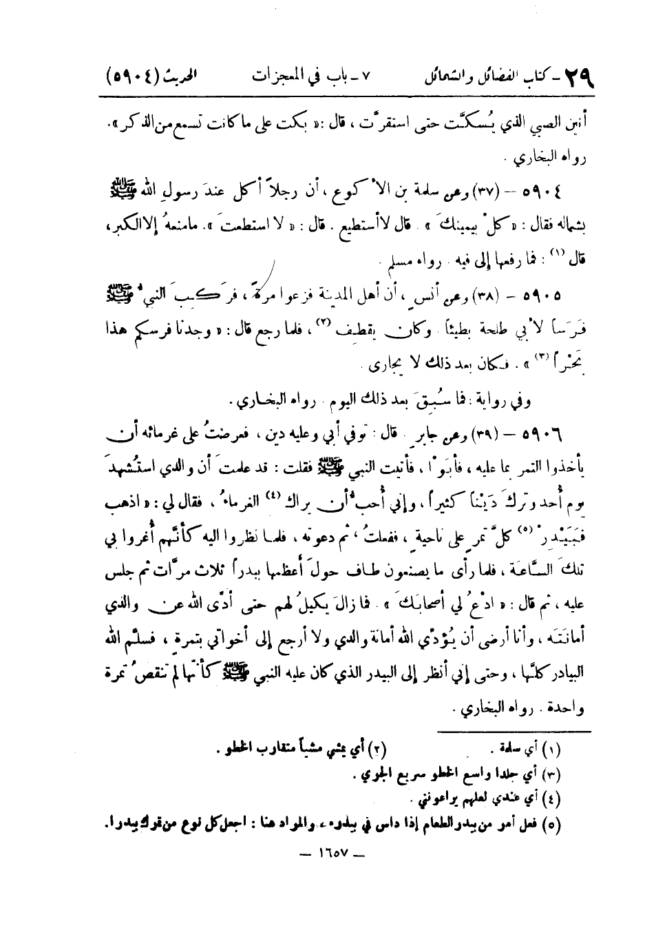 سَلمَة بن الْأَكْوَع أَنَّ رَجُلًا أَكَلَ عِنْدَ رَسُولِ اللَّهِ صَلَّى اللَّهُ عَلَيْهِ وَسَلَّمَ بِشَمَالِهِ فَقَالَ: «كُلْ بِيَمِينِكَ» قَالَ: لاأستطيع. قَالَ «لَا اسْتَطَعْتَ» . مَا مَنَعَهُ إِلَّا الْكِبْرُ قا ل: فَمَا رَفعهَا إِلَى فِيهِ. رَوَاهُ مُسلم