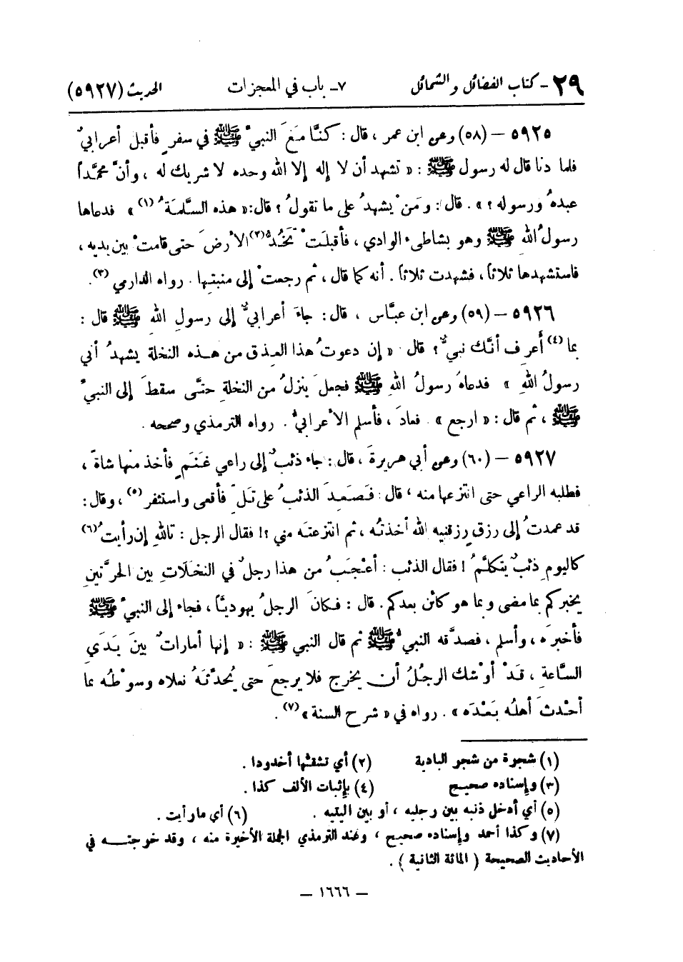 ابْنِ عُمَرَ قَالَ كُنَّا مَعَ النَّبِيِّ صَلَّى اللَّهُ عَلَيْهِ وَسَلَّمَ فِي سَفَرٍ فَأَقْبَلَ أَعْرَابِي فَلَمَّا دنا مِنْهُ قَالَ لَهُ رَسُولُ اللَّهِ صَلَّى اللَّهُ عَلَيْهِ وَسَلَّمَ تَشْهَدُ أَنْ لَا إِلَهَ إِلَّا اللَّهُ وَحْدَهُ لَا شَرِيكَ لَهُ وَأَنَّ مُحَمَّدًا عَبْدُهُ وَرَسُولَهُ قَالَ وَمَنْ يَشْهَدُ عَلَى مَا تَقُولُ؟ قَالَ: «هَذِهِ السَّلَمَةُ» فَدَعَاهَا رَسُولَ اللَّهِ صَلَّى اللَّهُ عَلَيْهِ وَسَلَّمَ وَهُوَ بِشَاطِئِ الْوَادِي فَأَقْبَلَتْ تَخُدُّ الْأَرْضَ حَتَّى قَامَتْ بَيْنَ يَدَيْهِ فَاسْتَشْهِدْهَا ثَلَاثًا فَشَهِدَتْ ثَلَاثًا أَنَّهُ كَمَا قَالَ ثُمَّ رجعتْ إِلى منبتِها. رَوَاهُ الدَّارمِيّ