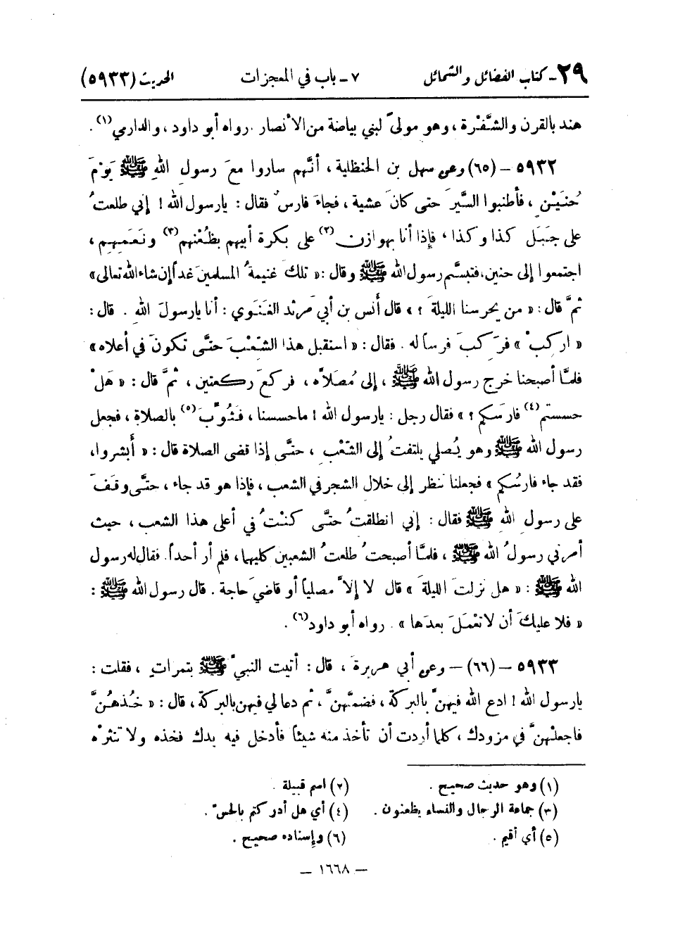 سهل ابْن الْحَنْظَلِيَّةِ أَنَّهُمْ سَارُوا مَعَ رَسُولِ اللَّهِ صَلَّى اللَّهُ عَلَيْهِ وَسَلَّمَ يَوْمَ حُنَيْنٍ فَأَطْنَبُوا السَّيْرَ حَتَّى كَانَت عَشِيَّةً فَجَاءَ فَارِسٌ فَقَالَ يَا رَسُولَ اللَّهِ إِنِّي طَلِعْتُ عَلَى جَبَلِ كَذَا وَكَذَا فَإِذَا أَنَا بِهَوَازِنَ عَلَى بَكْرَةِ أَبِيهِمْ بِظُعُنِهِمْ وَنَعَمِهِمُ اجْتَمَعُوا إِلَى حُنَيْنٍ فَتَبَسَّمَ رَسُولُ اللَّهِ صَلَّى اللَّهُ عَلَيْهِ وَسَلَّمَ وَقَالَ تِلْكَ غَنِيمَةٌ الْمُسْلِمِينَ غَدا إِن شَاءَ الله ثمَّ قَالَ مَنْ يَحْرُسُنَا اللَّيْلَةَ قَالَ أَنَسُ بْنُ أَبِي مَرْثَدٍ الْغَنَوِيُّ أَنَا يَا رَسُولَ اللَّهِ قَالَ ارْكَبْ فَرَكِبَ فَرَسًا لَهُ فَقَالَ: «اسْتَقْبِلْ هَذَا الشِّعْبَ حَتَّى تَكُونَ فِي أَعْلَاهُ» . فَلَمَّا أَصْبَحْنَا خَرَجَ رَسُولُ اللَّهِ صَلَّى اللَّهُ عَلَيْهِ وَسَلَّمَ إِلَى مُصَلَّاهُ فَرَكَعَ رَكْعَتَيْنِ ثُمَّ قَالَ هَلْ حسستم فارسكم قَالُوا يَا رَسُولَ اللَّهِ مَا حَسِسْنَا فَثُوِّبَ بِالصَّلَاةِ فَجَعَلَ رَسُولُ اللَّهِ صَلَّى اللَّهُ عَلَيْهِ وَسَلَّمَ يُصَلِّي وَهُوَ يَلْتَفِتُ إِلَى الشِّعْبِ حَتَّى إِذَا قَضَى الصَّلَاةَ قَالَ أَبْشِرُوا فَقَدْ جَاءَ فَارِسُكُمْ فَجَعَلْنَا نَنْظُرُ إِلَى خِلَالِ الشَّجَرِ فِي الشِّعْبِ فَإِذَا هُوَ قَدْ جَاءَ حَتَّى وَقَفَ عَلَى رَسُولِ اللَّهِ صَلَّى اللَّهُ عَلَيْهِ وَسَلَّمَ فَسلم فَقَالَ إِنِّي انْطَلَقْتُ حَتَّى كُنْتُ فِي أَعْلَى هَذَا الشِّعْبِ حَيْثُ أَمَرَنِي رَسُولُ اللَّهِ صَلَّى اللَّهُ عَلَيْهِ وَسَلَّمَ فَلَمَّا أَصبَحت اطَّلَعت الشِّعْبَيْنِ كِلَيْهِمَا فَلَمْ أَرَ أَحَدًا فَقَالَ لَهُ رَسُولُ اللَّهِ صَلَّى اللَّهُ عَلَيْهِ وَسَلَّمَ هَلْ نَزَلْتَ اللَّيْلَةَ قَالَ لَا إِلَّا مُصَلِّيَا أَوْ قَاضِيَ حَاجَةٍ قَالَ رَسُولُ اللَّهِ صَلَّى اللَّهُ عَلَيْهِ وَسَلَّمَ: «فَلَا عَلَيْكَ أَنْ لَا تَعْمَلَ بعدَها» . رَوَاهُ أَبُو دَاوُد