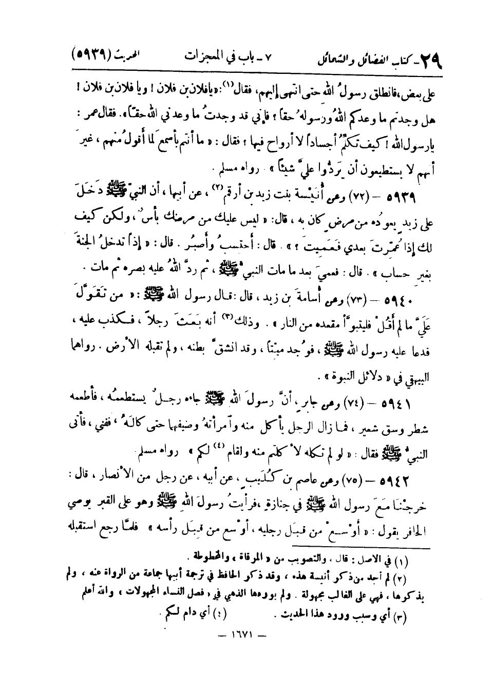 بِنْتِ زَيْدِ بْنِ أَرْقَمَ عَنْ أَبِيهَا إِنَّ النَّبِيَّ صَلَّى اللَّهُ عَلَيْهِ وَسَلَّمَ دَخَلَ عَلَى زَيْدٍ يَعُودُهُ مِنْ مَرَضٍ كَانَ بِهِ قَالَ: «لَيْسَ عَلَيْكَ مِنْ مَرَضِكَ بَأْسٌ وَلَكِنْ كَيْفَ لَكَ إِذَا عُمِّرْتَ بَعْدِي فَعَمِيتَ؟» قَالَ: أَحْتَسِبُ وَأَصْبِرُ. قَالَ: «إِذًا تَدْخُلِ الْجَنَّةَ بِغَيْرِ حِسَاب» . قَالَ: فَعَمِيَ بَعْدَ مَا مَاتَ النَّبِيُّ صَلَّى اللَّهُ عَلَيْهِ وَسلم ثمَّ ردَّ اللَّهُ بَصَره ثمَّ مَاتَ