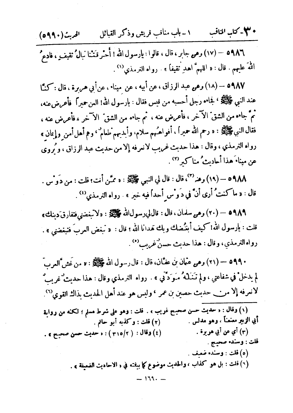 عُثْمَان بن عَفَّان قَالَ: قَالَ رَسُولُ اللَّهِ صَلَّى اللَّهُ عَلَيْهِ وَسَلَّمَ: «مَنْ غَشَّ الْعَرَبَ لَمْ يَدْخُلْ فِي شَفَاعَتِي وَلَمْ تَنَلْهُ مَوَدَّتِي» . رَوَاهُ التِّرْمِذِيُّ وَقَالَ: هَذَا حَدِيثٌ غَرِيبٌ لَا نَعْرِفُهُ إِلَّا مِنْ حَدِيثِ حُصَيْنِ بْنِ عُمَرَ وَلَيْسَ هُوَ عِنْدَ أهل الحَدِيث بِذَاكَ الْقوي