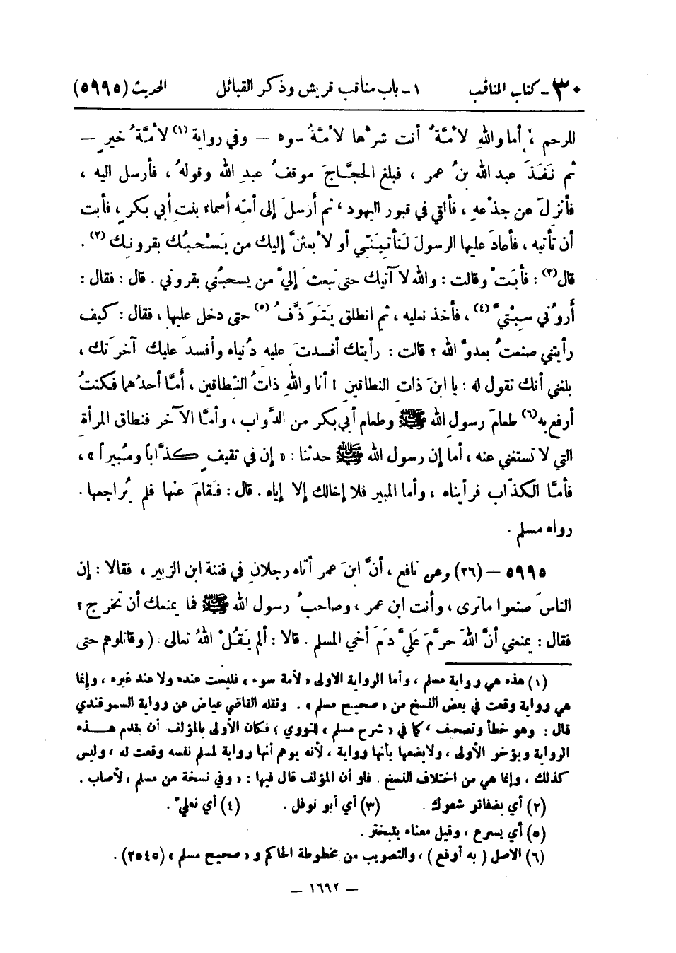 نَافِع عَن ابْنَ عُمَرَ أَتَاهُ رَجُلَانِ فِي فِتْنَةِ ابْنِ الزُّبَيْرِ فَقَالَا: إِنَّ النَّاسَ صَنَعُوا مَا تَرَى وَأَنْتَ ابْنُ عُمَرَ وَصَاحِبُ رَسُولَ اللَّهِ صَلَّى اللَّهُ عَلَيْهِ وَسَلَّمَ فَمَا يَمْنَعُكَ أَنْ تَخْرُجَ؟ فَقَالَ: يَمْنعنِي أنَّ اللَّهَ حرم دَمَ أَخِي الْمُسْلِمِ. قَالَا: أَلَمْ يَقُلِ اللَّهُ: [وقاتلوهم حَتَّى -[1693]- لَا تكونَ فتْنَة] فَقَالَ ابْنُ عُمَرَ: قَدْ قَاتَلْنَا حَتَّى لَمْ تَكُنْ فِتْنَةٌ وَكَانَ الدِّينُ لِلَّهِ وَأَنْتُمْ تُرِيدُونَ أَنْ تُقَاتِلُوا حَتَّى تَكُونَ فِتْنَةٌ وَيَكُونَ الدِّينُ لغيرِ اللَّهِ. رَوَاهُ البُخَارِيّ