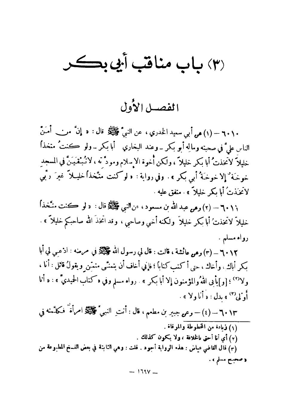 عَنْ أَبِي سَعِيدٍ الْخُدْرِيِّ عَنِ النَّبِيِّ صَلَّى اللَّهُ عَلَيْهِ وَسَلَّمَ قَالَ: «إِنَّ مِنْ أَمَنِّ النَّاسِ عَلَيَّ فِي صُحْبَتِهِ وَمَالِهِ أَبُو بَكْرٍ - وَعِنْدَ الْبُخَارِيِّ أَبَا بَكْرٍ - وَلَوْ كُنْتُ مُتَّخِذًا خَلِيلًا لَاتَّخَذْتُ أَبَا بَكْرٍ خَلِيلًا وَلَكِنْ أُخُوَّةُ الْإِسْلَامِ وَمَوَدَّتُهُ لَا تُبْقَيَنَّ فِي الْمَسْجِدِ خَوْخَةٌ إِلَّا خَوْخَةَ أَبِي بَكْرٍ» . وَفِي رِوَايَةٍ: «لَوْ كُنْتُ مُتَّخِذًا خَلِيلًا غَيْرَ رَبِّي لَاتَّخَذْتُ أَبَا بَكْرٍ خَلِيلًا» . مُتَّفَقٌ عَلَيْهِ