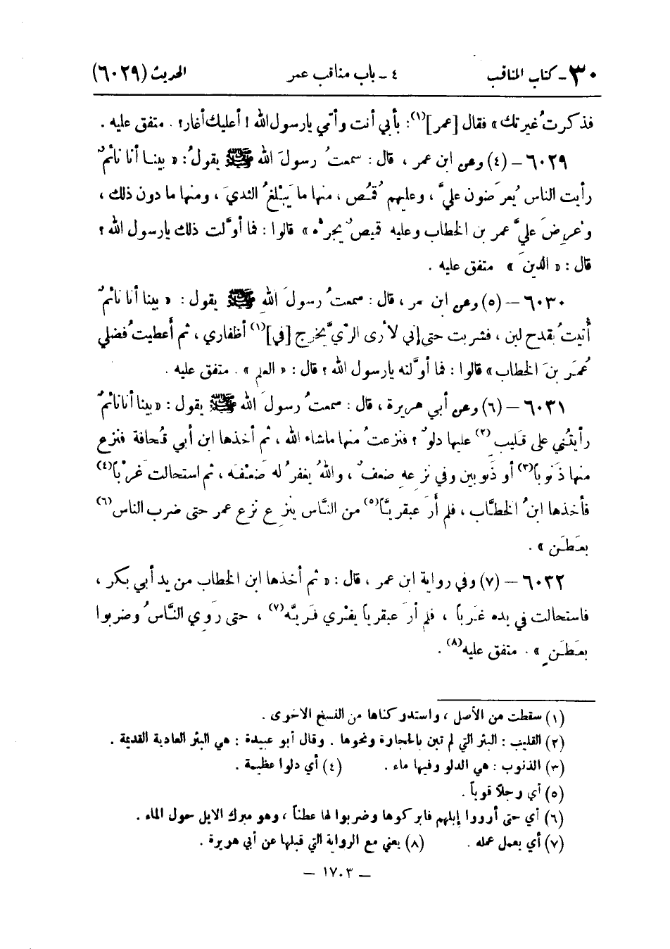 وَعَنْ أَبِي هُرَيْرَةَ قَالَ: سَمِعْتُ رَسُولَ اللَّهِ صَلَّى اللَّهُ عَلَيْهِ وَسَلَّمَ يَقُولُ: «بَيْنَا أَنَا نَائِمٌ رَأَيْتُنِي عَلَى قَلِيبٍ عَلَيْهَا دَلْوٌ؟ فَنَزَعْتُ مِنْهَا مَا شَاءَ اللَّهُ ثُمَّ أَخَذَهَا ابْنُ أَبِي قُحَافَةَ فَنَزَعَ مِنْهَا ذَنُوبًا أَوْ ذَنُوبَيْنِ وَفِي نَزْعِهِ ضَعْفٌ وَاللَّهُ يَغْفِرُ لَهُ ضَعْفَهُ ثُمَّ اسْتَحَالَتْ غَرْبًا فَأَخَذَهَا ابْنُ الْخَطَّابِ فَلَمْ أَرَ عَبْقَرِيًّا مِنَ النَّاسِ يَنْزِعُ نَزْعَ عُمَرَ حَتَّى ضرب النَّاس بِعَطَن»