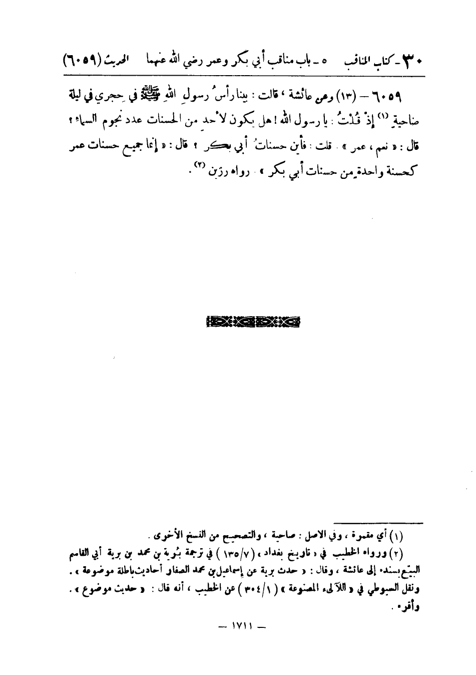 عَائِشَة قَالَتْ: بَيْنَا رَأْسَ رَسُولِ اللَّهِ صَلَّى اللَّهُ عَلَيْهِ وَسَلَّمَ فِي حجري لَيْلَةٍ ضَاحِيَةٍ إِذْ قُلْتُ: يَا رَسُولَ اللَّهِ هَلْ يَكُونُ لِأَحَدٍ مِنَ الْحَسَنَاتِ عَدَدُ نُجُومِ السَّمَاءِ؟ قَالَ: «نَعَمْ عُمَرُ» . قُلْتُ: فَأَيْنَ حَسَنَاتُ أَبِي بَكْرٍ؟ قَالَ: «إِنَّمَا جَمِيعُ حَسَنَاتِ عُمَرَ كَحَسَنَةٍ وَاحِدَةٍ مِنْ حَسَنَاتِ أَبِي بَكْرٍ» رَوَاهُ رزين