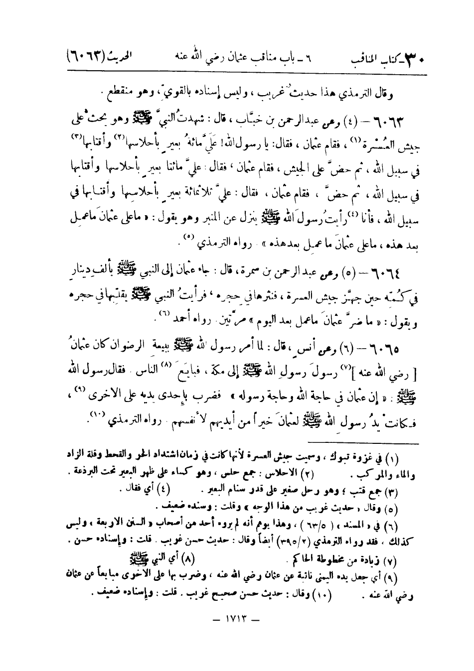 وَعَنْ عَبْدِ الرَّحْمَنِ بْنِ خَبَّابٍ قَالَ: شَهِدْتُ النَّبِيَّ صَلَّى اللَّهُ عَلَيْهِ وَسَلَّمَ وَهُوَ يَحُثُّ عَلَى جَيْشِ الْعُسْرَةِ فَقَامَ عُثْمَانُ فَقَالَ: يَا رَسُول الله عَلَيَّ مِائَتَا بَعِيرٍ بِأَحْلَاسِهَا وَأَقْتَابِهَا فِي سَبِيلِ اللَّهِ ثُمَّ حَضَّ عَلَى الْجَيْشِ فَقَامَ عُثْمَانُ فَقَالَ: عَلَيَّ مِائَتَا بَعِيرٍ بِأَحْلَاسِهَا وَأَقْتَابِهَا فِي سَبِيلِ اللَّهِ ثُمَّ حَضَّ فَقَامَ عُثْمَانُ فَقَالَ: عَلَيَّ ثَلَاثُمِائَةِ بَعِيرٍ بِأَحْلَاسِهَا وَأَقْتَابِهَا فِي سَبِيلِ اللَّهِ فَأَنَا رَأَيْتُ رَسُولَ اللَّهِ صَلَّى اللَّهُ عَلَيْهِ وَسَلَّمَ يَنْزِلُ عَنِ الْمِنْبَرِ وَهُوَ يَقُولُ: «مَا عَلَى عُثْمَانَ مَا عَمِلَ بَعْدَ هَذِهِ مَا عَلَى عُثْمَانَ مَا عَمِلَ بَعْدَ هَذِهِ» . رَوَاهُ التِّرْمِذِيّ