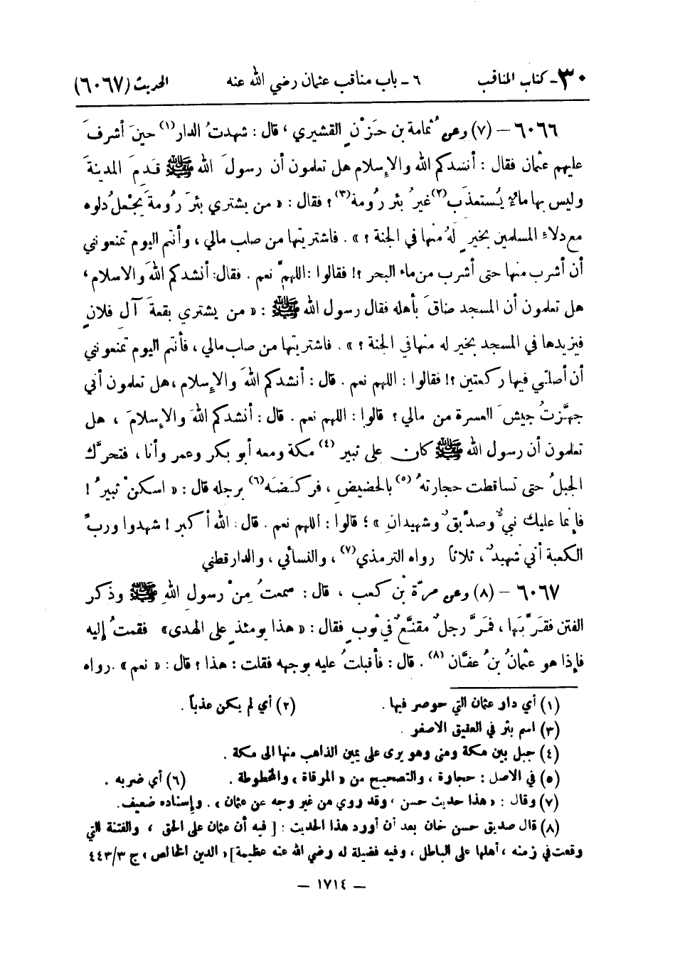 وَعَن ثُمامة بن حَزْنٍ الْقشيرِي قَالَ: شَهِدْتُ الدَّارَ حِينَ أَشْرَفَ عَلَيْهِمْ عُثْمَانُ فَقَالَ: أنْشدكُمْ بِاللَّه وَالْإِسْلَامَ هَلْ تَعْلَمُونَ أَنَّ رَسُولَ اللَّهِ صَلَّى اللَّهُ عَلَيْهِ وَسَلَّمَ قَدِمَ الْمَدِينَةَ وَلَيْسَ بِهَا مَاءٌ يُسْتَعْذَبُ غَيْرُ بِئْرِ رُومَةَ؟ فَقَالَ: «مَنْ يَشْتَرِي بِئْرَ رُومَةَ يَجْعَلُ دَلْوَهُ مَعَ دِلَاءِ الْمُسْلِمِينَ بِخَيْرٍ لَهُ مِنْهَا فِي الْجَنَّةِ؟» فَاشْتَرَيْتُهَا مِنْ صُلْبِ مَالِي وَأَنْتُمُ الْيَوْمَ تَمْنَعُونَنِي أَنْ أَشْرَبَ مِنْهَا حَتَّى أَشْرَبَ مِنْ مَاءِ الْبَحْرِ؟ قَالُوا: اللَّهُمَّ نعم. فَقَالَ: أنْشدكُمْ بِاللَّه وَالْإِسْلَامَ هَلْ تَعْلَمُونَ أَنَّ الْمَسْجِدَ ضَاقَ بِأَهْلِهِ فَقَالَ رَسُولُ اللَّهِ صَلَّى اللَّهُ عَلَيْهِ وَسَلَّمَ: «مَنْ يَشْتَرِي بُقْعَةَ آلِ فُلَانٍ فَيَزِيدُهَا فِي الْمَسْجِد بِخَير مِنْهَا فِي الْجَنَّةِ؟» . فَاشْتَرَيْتُهَا مِنْ صُلْبِ مَالِي فَأَنْتُمُ الْيَوْمَ تَمْنَعُونَنِي أَنْ أُصَلِّيَ فِيهَا رَكْعَتَيْنِ؟ فَقَالُوا: اللَّهُمَّ نعم. قَالَ: أنْشدكُمْ بِاللَّه وَالْإِسْلَامَ هَلْ تَعْلَمُونَ أَنِّي جَهَّزْتُ جَيْشَ الْعُسْرَةِ مِنْ مَالِي؟ قَالُوا: اللَّهُمَّ نَعَمْ. قَالَ: أَنْشُدُكُمُ بِاللَّه وَالْإِسْلَامَ هَلْ تَعْلَمُونَ أَنَّ رَسُولَ اللَّهِ صَلَّى اللَّهُ عَلَيْهِ وَسَلَّمَ كَانَ عَلَى ثَبِيرِ مَكَّةَ وَمَعَهُ أَبُو بَكْرٍ وَعُمَرُ وَأَنَا فَتَحَرَّكَ الْجَبَلُ حَتَّى تَسَاقَطَتْ حِجَارَتُهُ بِالْحَضِيضِ فَرَكَضَهُ بِرِجْلِهِ قَالَ: «اسْكُنْ ثَبِيرُ فَإِنَّمَا عَلَيْكَ نَبِيُّ وَصِدِّيقٌ وَشَهِيدَانِ» . قَالُوا: اللَّهُمَّ نَعَمْ. قَالَ: اللَّهُ أَكْبَرُ شَهِدُوا وَرَبِّ الْكَعْبَةِ أَنِّي شَهِيدٌ ثَلَاثًا. رَوَاهُ التِّرْمِذِيُّ وَالنَّسَائِيّ وَالدَّارَقُطْنِيّ
