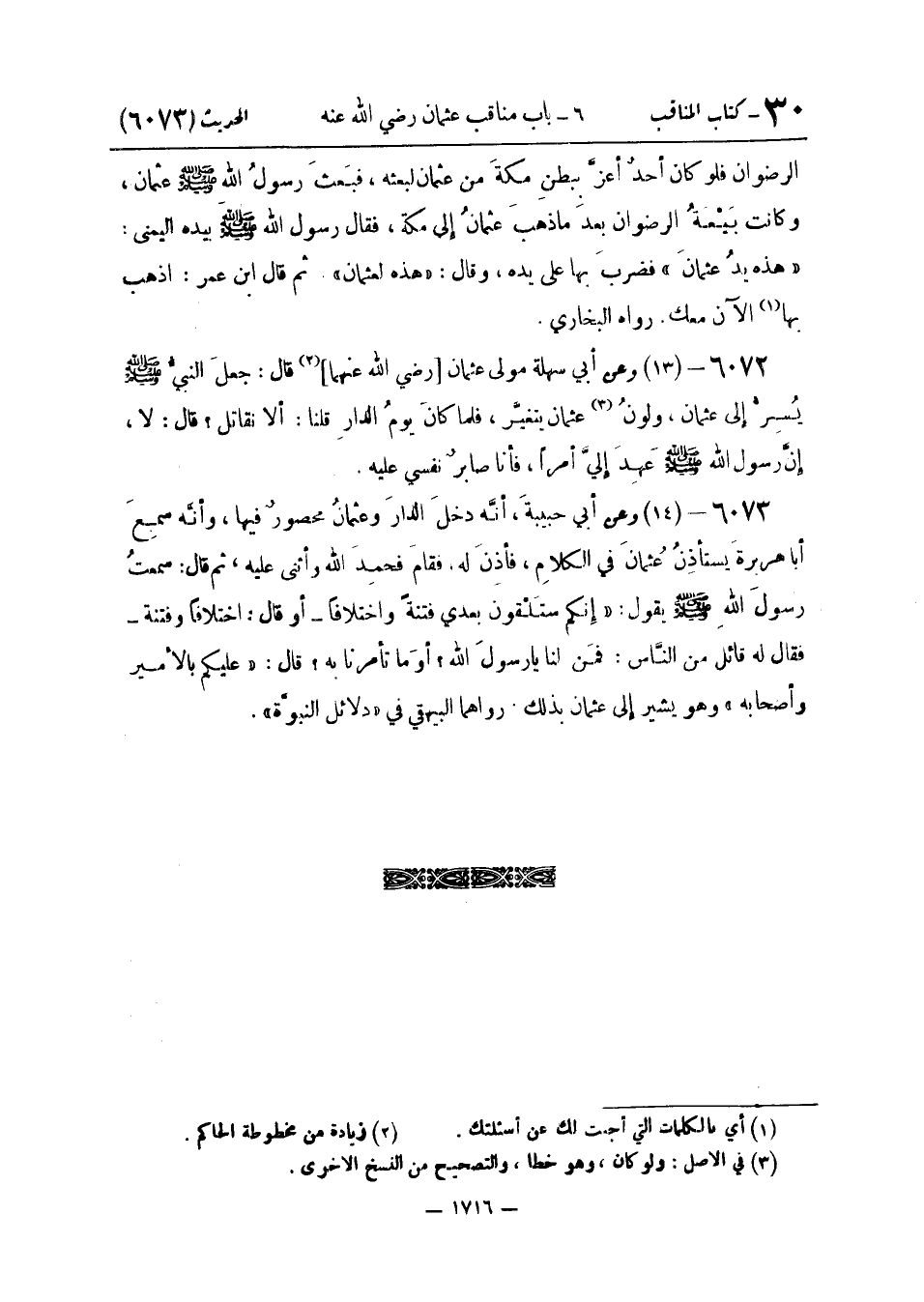 سلهة مولى عُثْمَان رَضِي الله عَنْهُمَا قَالَ: جَعَلَ النَّبِيُّ صَلَّى اللَّهُ عَلَيْهِ وَسَلَّمَ يُسِرُّ إِلَى عُثْمَانَ وَلَوْنُ عُثْمَانَ يَتَغَيَّرُ فَلَمَّا كَانَ يَوْم الدَّار قُلْنَا: أَلا نُقَاتِل؟ قَالَ: لَا أَنَّ رَسُولَ اللَّهِ صَلَّى اللَّهُ عَلَيْهِ وَسَلَّمَ عَهِدَ إِلَيَّ أَمْرًا فَأَنَا صَابِرٌ نَفسِي عَلَيْهِ