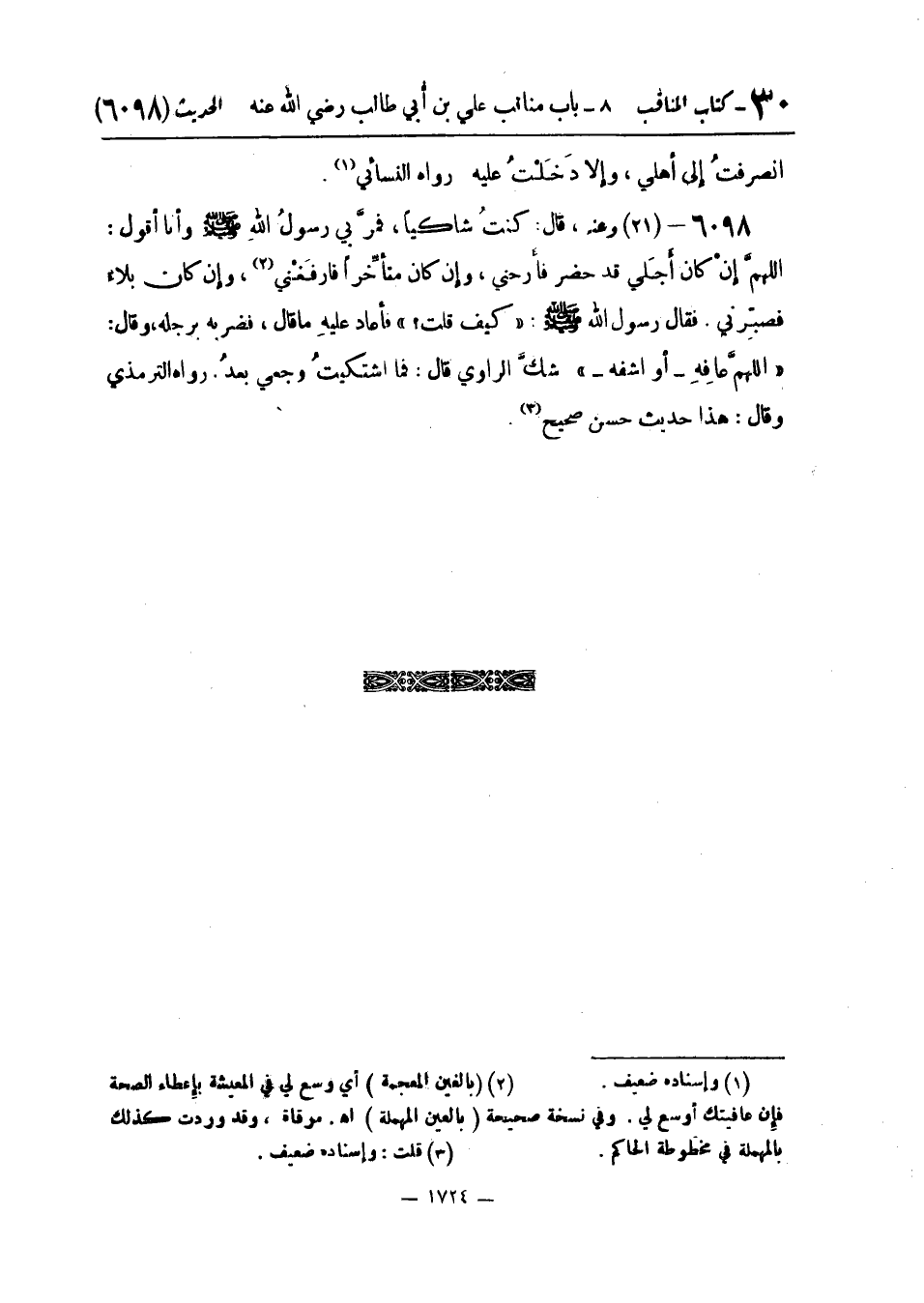 قَالَ: كُنْتُ شَاكِيًا فَمَرَّ بِي رَسُولُ اللَّهِ صَلَّى اللَّهُ عَلَيْهِ وَسَلَّمَ وَأَنَا أَقُولُ: اللَّهُمَّ إِنْ كَانَ أَجَلِي قَدْ حَضَرَ فَأَرِحْنِي وَإِن كَانَ متأخِّراً فارفَعْني وَإِنْ كَانَ بَلَاءً فَصَبِّرْنِي. فَقَالَ رَسُولُ اللَّهِ صَلَّى اللَّهُ عَلَيْهِ وَسَلَّمَ: «كَيْفَ قُلْتَ؟» فَأَعَادَ عَلَيْهِ مَا قَالَ فَضَرَبَهُ بِرِجْلِهِ وَقَالَ: «اللَّهُمَّ عَافِهِ - أَوِ اشْفِهِ -» شَكَّ الرَّاوِي قَالَ: فَمَا اشْتَكَيْتُ وَجَعِي بَعْدُ. رَوَاهُ التِّرْمِذِيُّ وَقَالَ: هَذَا حَدِيثٌ حَسَنٌ صَحِيحٌ