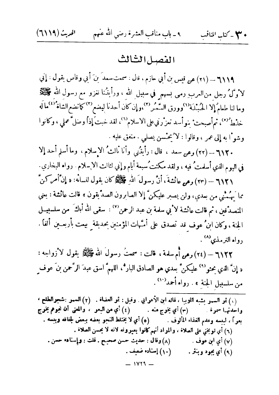 سَعْدٍ قَالَ: رَأَيْتُنِي وَأَنَا ثَالِثُ الْإِسْلَامِ وَمَا أَسْلَمَ أَحَدٌ إِلَّا فِي الْيَوْمِ الَّذِي أَسْلَمْتُ فِيهِ وَلَقَدْ مَكَثْتُ سَبْعَةَ أَيَّامٍ وَإِنِّي لثالث الْإِسْلَام. رَوَاهُ البُخَارِيّ