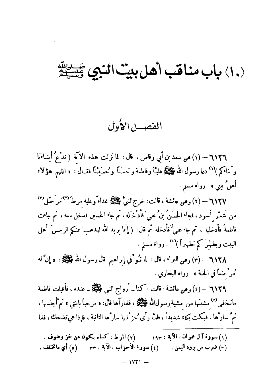 وَعَنْ عَائِشَةَ قَالَتْ: خَرَجَ النَّبِيُّ صَلَّى اللَّهُ عَلَيْهِ وَسَلَّمَ غَدَاةً وَعَلَيْهِ مِرْطٌ مُرَحَّلٌ مِنْ شَعْرٍ أَسْوَدَ فَجَاءَ الْحَسَنُ بْنُ عَلِيٍّ فَأَدْخَلَهُ ثُمَّ جَاءَ الْحُسَيْنُ فَدَخَلَ مَعَهُ ثُمَّ جَاءَتْ فَاطِمَةُ فَأَدْخَلَهَا ثُمَّ جَاءَ عَلَيٌّ فَأَدْخَلَهُ ثُمَّ قَالَ: [إِنَّمَا يُرِيدُ اللَّهُ لِيُذْهِبَ عَنْكُمُ الرِّجْسَ أهل الْبَيْت وَيُطَهِّركُمْ تَطْهِيرا] رَوَاهُ مُسلم