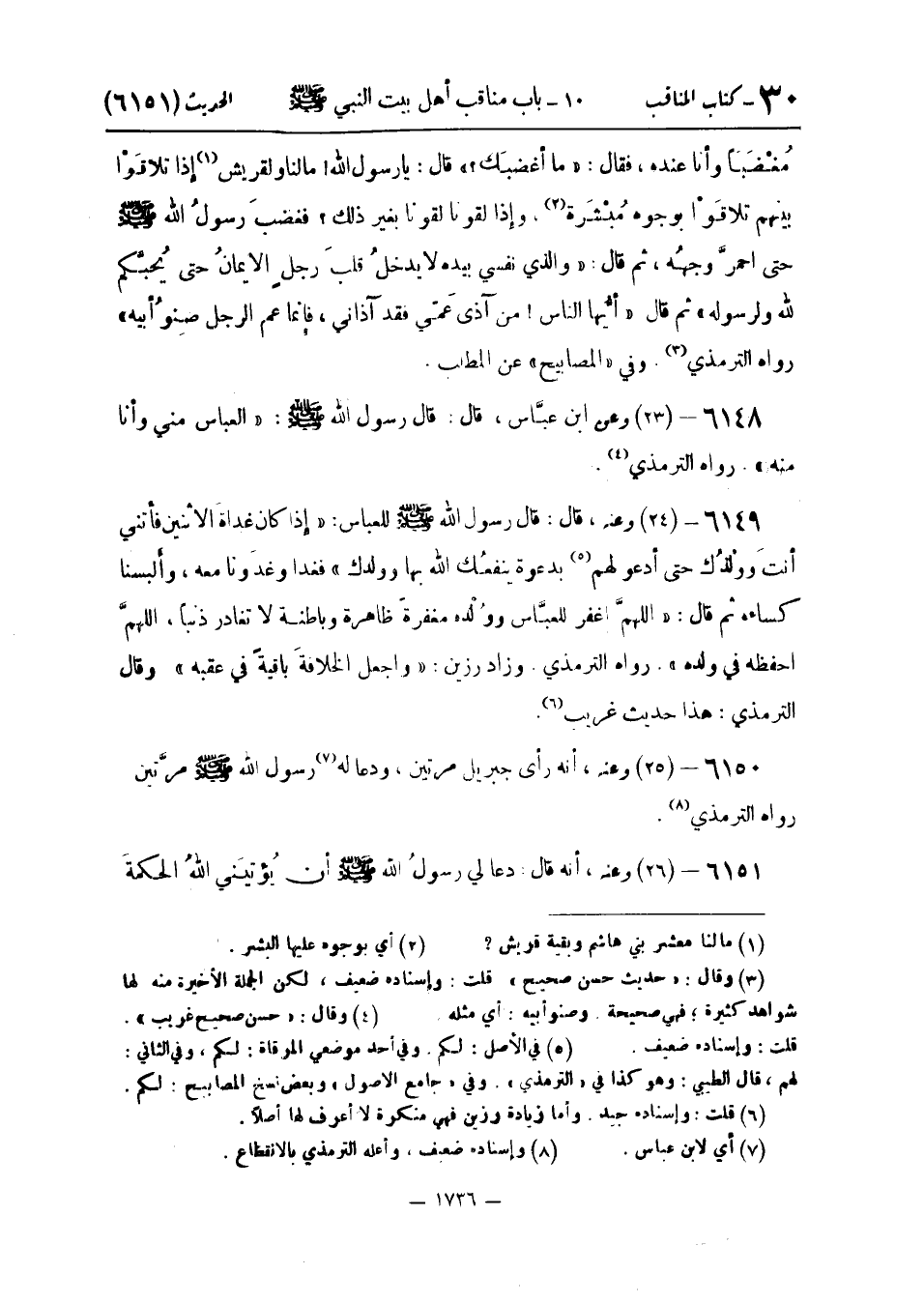 وَعَنْهُ قَالَ: قَالَ رَسُولُ اللَّهِ صَلَّى اللَّهُ عَلَيْهِ وَسَلَّمَ لِلْعَبَّاسِ: «إِذَا كَانَ غَدَاةَ الِاثْنَيْنِ فَأْتِنِي أَنْتَ وَوَلَدُكَ حَتَّى أَدْعُوَ لَهُمْ بِدَعْوَةٍ يَنْفَعُكَ اللَّهُ بِهَا وَوَلَدَكَ» فَغَدَا وَغَدَوْنَا مَعَهُ وَأَلْبَسَنَا كِسَاءَهُ ثُمَّ قَالَ: «اللَّهُمَّ اغْفِرْ لِلْعَبَّاسِ وَوَلَدِهِ مَغْفِرَةً ظَاهِرَةً وَبَاطِنَةً لَا تُغَادِرُ ذَنْبًا اللَّهُمَّ احْفَظْهُ فِي وَلَدِهِ» . رَوَاهُ التِّرْمِذِيُّ وَزَادَ رَزِينٌ: «وَاجْعَلِ الْخِلَافَةَ بَاقِيَةً فِي عَقِبِهِ» وَقَالَ التِّرْمِذِيّ: هَذَا حَدِيث غَرِيب