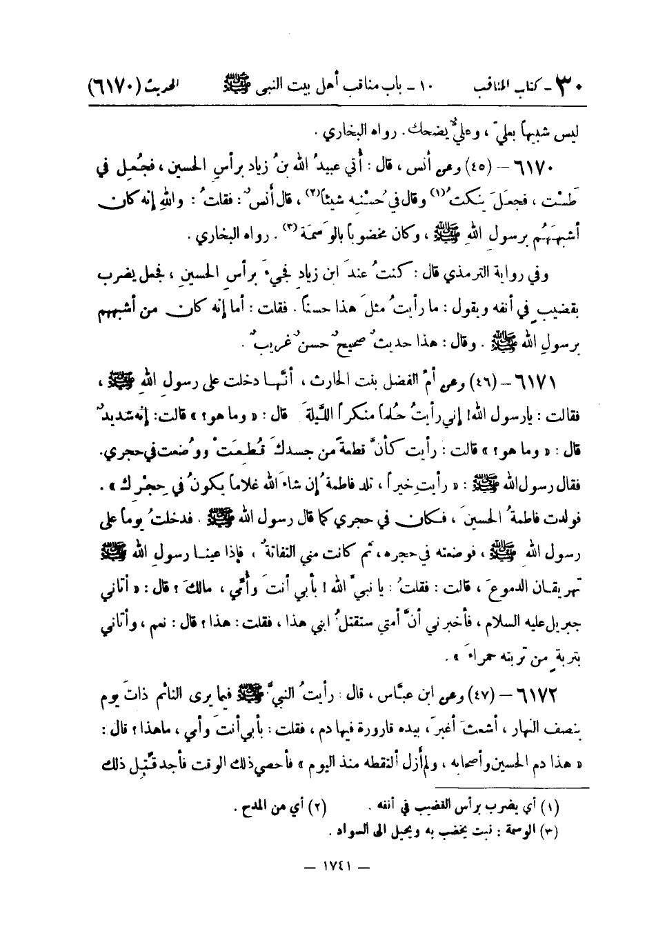وَفِي رِوَايَةِ التِّرْمِذِيِّ قَالَ: كُنْتُ عِنْدَ ابْنِ زِيَادٍ فَجِيءَ بِرَأْسِ الْحُسَيْنِ فَجَعَلَ يَضْرِبُ بِقَضِيبٍ فِي أَنْفِهِ وَيَقُولُ: مَا رَأَيْتُ مِثْلَ هَذَا حسنا. فَقلت: أما إِنَّهُ كَانَ أَشْبَهَهُمْ بِرَسُولِ اللَّهِ صَلَّى اللَّهُ عَلَيْهِ وَسَلَّمَ. وَقَالَ: هَذَا حَدِيثٌ صَحِيحٌ حَسَنٌ غَرِيب