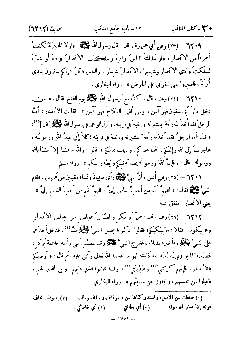 أَبِي هُرَيْرَةَ قَالَ: قَالَ رَسُولُ اللَّهِ صَلَّى اللَّهُ عَلَيْهِ وَسَلَّمَ: «لَوْلَا الْهِجْرَةُ لَكُنْتُ امْرَءًا مِنَ الْأَنْصَارِ وَلَوْ سَلَكَ النَّاسُ وَادِيًا وَسَلَكَتِ الْأَنْصَارُ وَادِيًا أَوْ شِعْبًا لَسَلَكْتُ وَادِيَ الْأَنْصَارِ وشعبها وَالْأَنْصَار شِعَارٌ وَالنَّاسُ دِثَارٌ إِنَّكُمْ سَتَرَوْنَ بَعْدِي أَثَرَةً فَاصْبِرُوا حَتَّى تَلْقَوْنِي عَلَى الْحَوْضِ» . رَوَاهُ الْبُخَارِيُّ