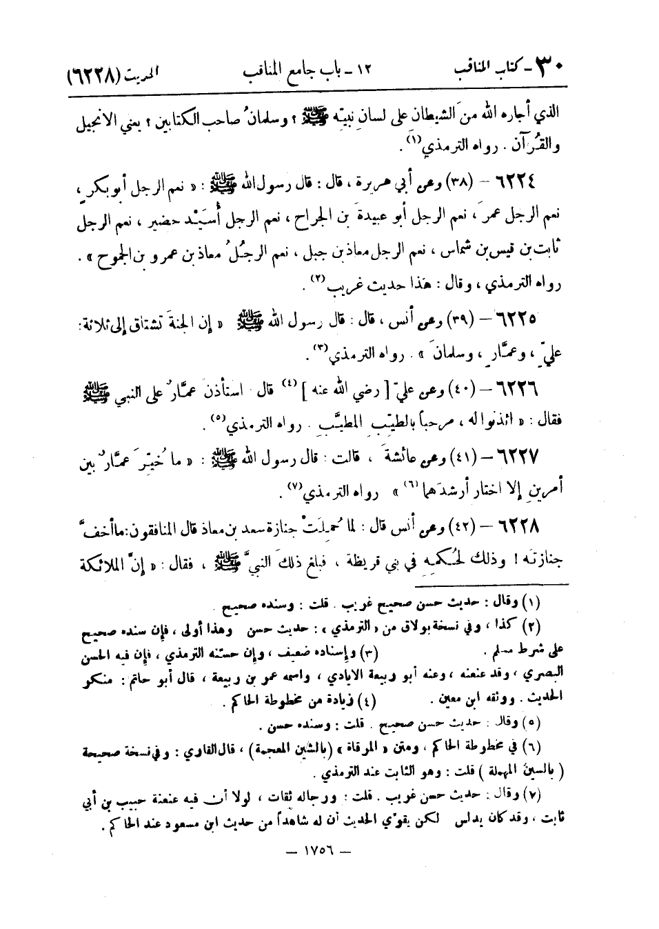 أَبِي هُرَيْرَةَ قَالَ: قَالَ رَسُولُ اللَّهِ صَلَّى اللَّهُ عَلَيْهِ وَسَلَّمَ: «نِعْمَ الرَّجُلُ أَبُو بَكْرٍ نِعْمَ الرَّجُلُ عُمَرُ نِعْمَ الرَّجُلُ أَبُو عُبَيْدَةَ بْنُ الْجَرَّاحِ نِعْمَ الرَّجُلُ أُسَيْدُ بْنُ حُضَيْرٍ نِعْمَ الرَّجُلُ ثَابِتُ بْنُ قَيْسِ بْنِ شَمَّاسٍ نِعْمَ الرَّجُلُ مُعَاذُ بْنُ جَبَلٍ نِعْمَ الرَّجُلُ مُعَاذُ بْنُ عَمْرِو بْنِ الْجَمُوحِ» . رَوَاهُ التِّرْمِذِيُّ وَقَالَ: هَذَا حَدِيثٌ غَرِيبٌ