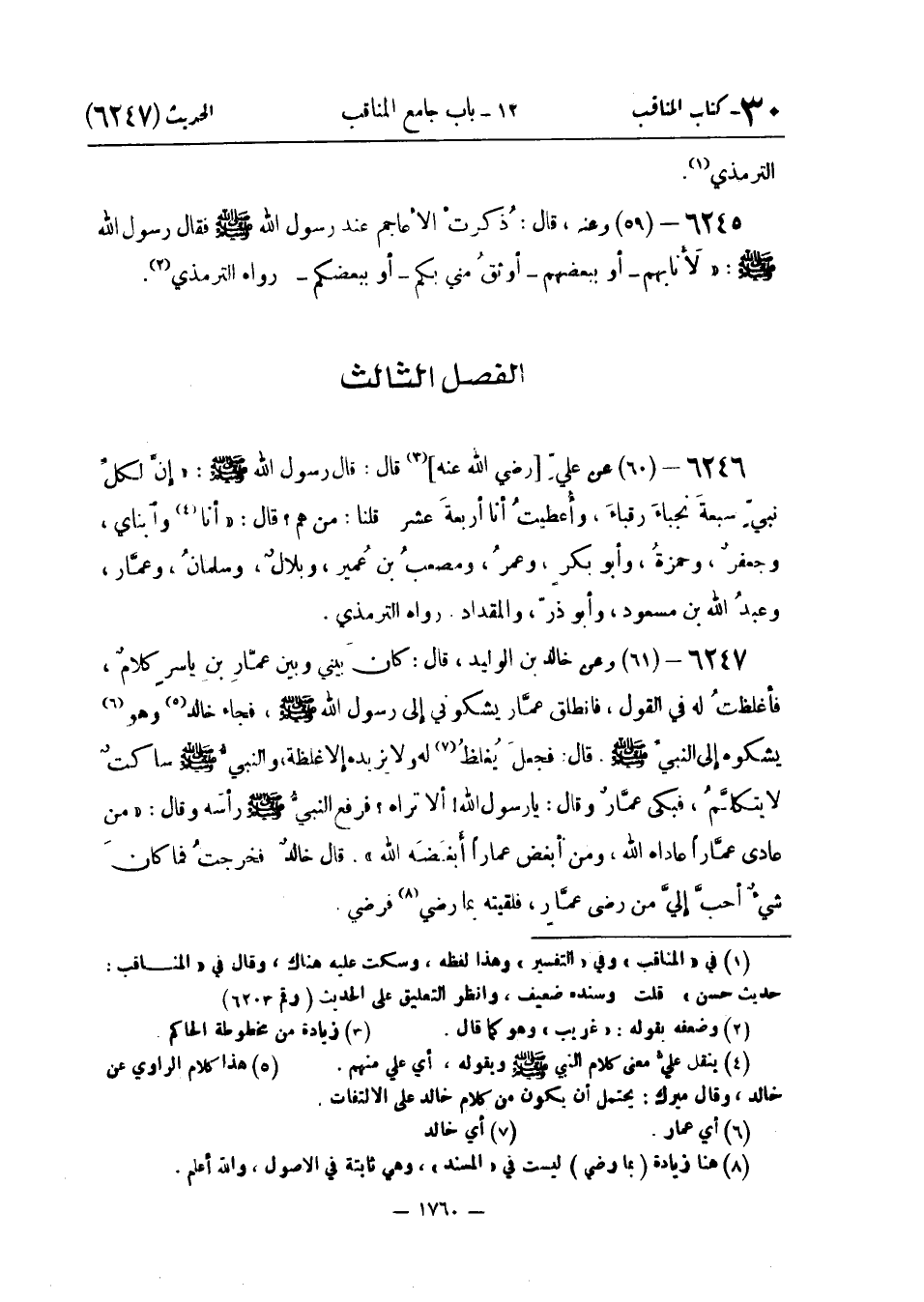 رَضِيَ اللَّهُ عَنْهُ قَالَ: قَالَ رَسُولُ اللَّهِ صَلَّى اللَّهُ عَلَيْهِ وَسَلَّمَ: " إِنَّ لِكُلِّ نَبِيٍّ سَبْعَةَ نُجَبَاءَ رُقَبَاءَ وَأُعْطِيْتُ أَنَا أَرْبَعَةَ عشرَة قُلْنَا: مَنْ هُمْ؟ قَالَ: " أَنَا وَابْنَايَ وَجَعْفَرٌ وَحَمْزَةُ وَأَبُو بَكْرٍ وَعُمَرُ وَمُصْعَبُ بْنُ عُمَيْرٍ وَبِلَالٌ وَسَلْمَانُ وَعَمَّارٌ وَعَبْدُ اللَّهِ بْنُ مَسْعُودٍ وَأَبُو ذَر والمقداد. رَوَاهُ التِّرْمِذِيّ