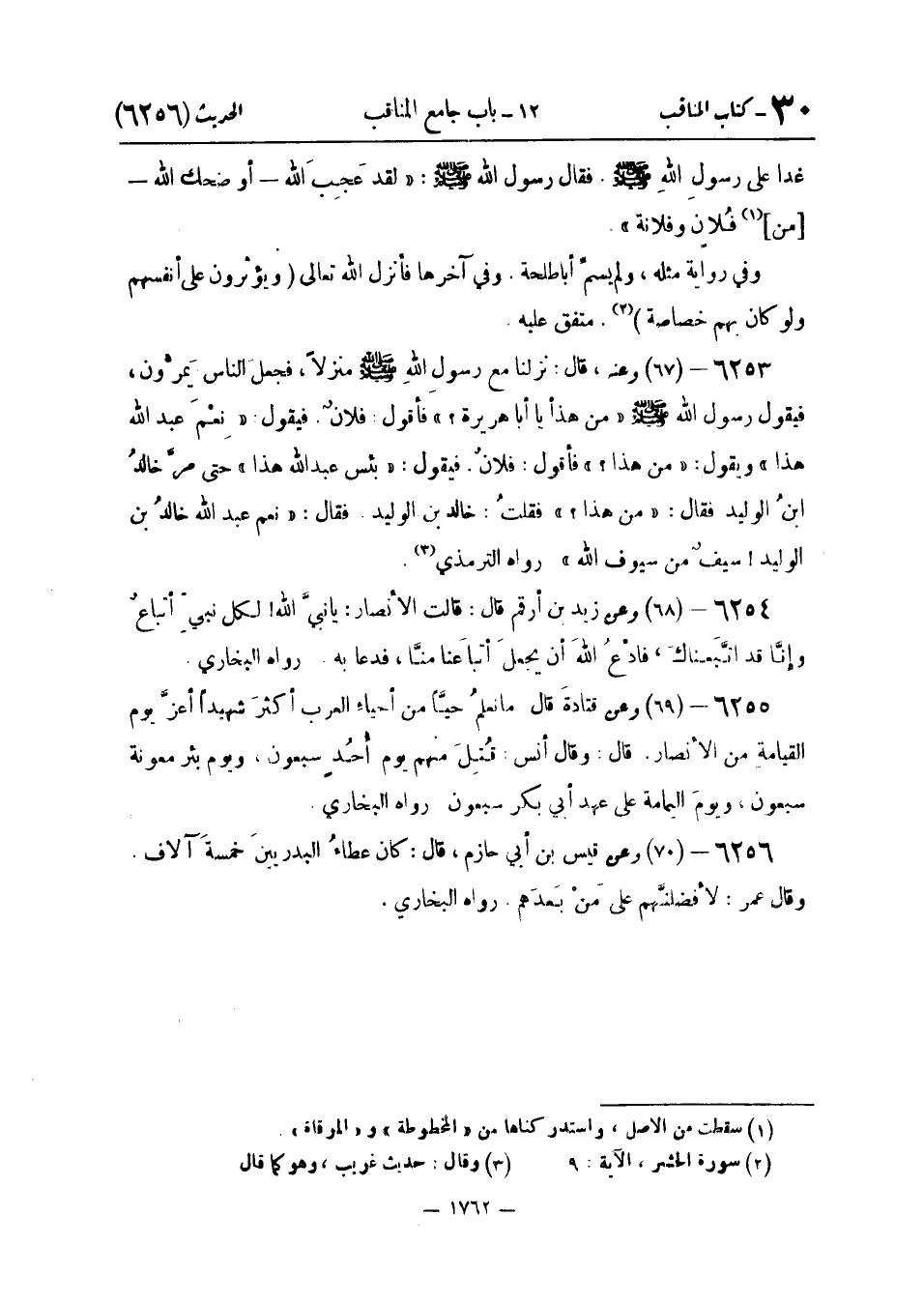 قَتَادَةَ قَالَ مَا نَعْلَمُ حَيًّا مِنْ أَحْيَاءِ الْعَرَبِ أَكْثَرَ شَهِيدًا أَعَزَّ يَوْمَ الْقِيَامَةِ مِنَ الْأَنْصَارِ. قَالَ: وَقَالَ أَنَسٌ: قُتِلَ مِنْهُمْ يَوْمَ أُحُدٍ سَبْعُونَ وَيَوْمَ بِئْرِ مَعُونَةَ سَبْعُونَ وَيَوْمَ الْيَمَامَةِ عَلَى عَهْدِ أَبِي بَكْرٍ سَبْعُونَ. رَوَاهُ البُخَارِيّ