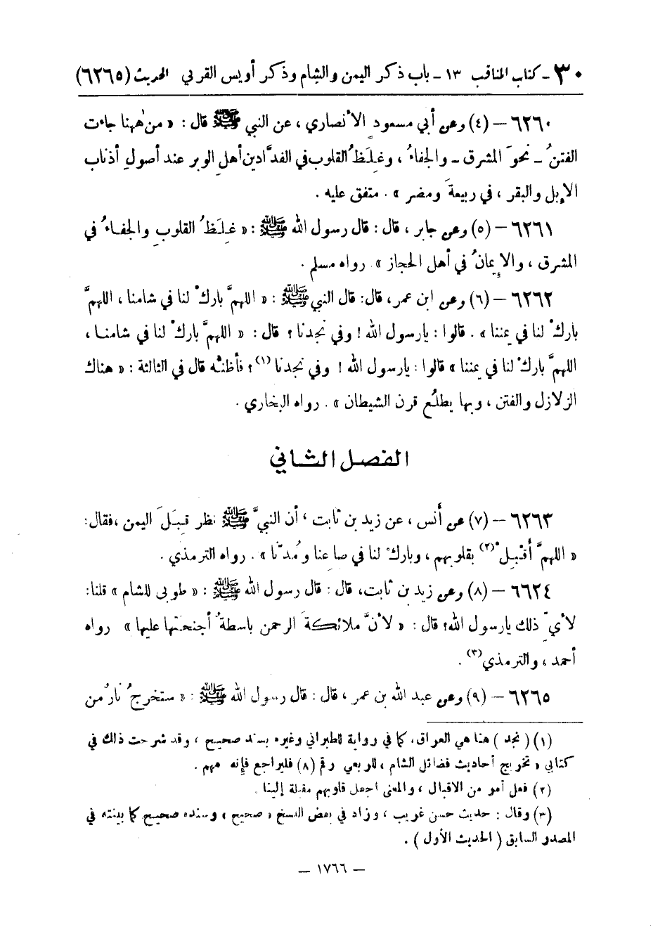 وَعَنِ ابْنِ عُمَرَ قَالَ: قَالَ النَّبِيُّ صَلَّى اللَّهُ عَلَيْهِ وَسَلَّمَ: «اللَّهُمَّ بَارِكْ لَنَا فِي شَامِنَا اللَّهُمَّ بَارِكْ لَنَا فِي يَمَنِنَا» . قَالُوا: يَا رَسُولَ اللَّهِ وَفِي نَجْدِنَا؟ فَأَظُنُّهُ قَالَ فِي الثَّالِثَةِ: «هُنَاكَ الزَّلَازِلُ وَالْفِتَنُ وَبِهَا يَطْلُعُ قرن الشَّيْطَان» . رَوَاهُ البُخَارِيّ