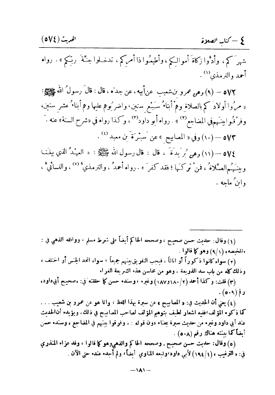 وَعَنْ عَمْرِو بْنِ شُعَيْبٍ عَنْ أَبِيهِ عَنْ جَدِّهِ قَالَ: قَالَ رَسُولُ اللَّهِ صَلَّى اللَّهُ عَلَيْهِ وَسَلَّمَ: «مُرُوا أَوْلَادَكُمْ بِالصَّلَاةِ وَهُمْ أَبْنَاءُ سَبْعِ سِنِينَ وَاضْرِبُوهُمْ عَلَيْهَا وَهُمْ أَبْنَاءُ عَشْرٍ سِنِين وَفَرِّقُوا بَيْنَهُمْ فِي الْمَضَاجِعِ» . رَوَاهُ أَبُو دَاوُدَ وَكَذَا رَوَاهُ فِي شرح السّنة عَنهُ