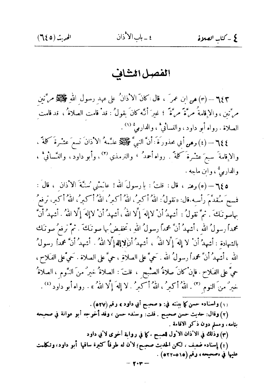 وَعَنْهُ قَالَ: قُلْتُ يَا رَسُولَ اللَّهِ عَلِّمْنِي سنة الْأَذَان قَالَ: فَمسح مقدم رَأسه. وَقَالَ: " وَتقول اللَّهُ أَكْبَرُ اللَّهُ أَكْبَرُ اللَّهُ أَكْبَرُ اللَّهُ أَكْبَرُ تَرْفَعُ بِهَا صَوْتَكَ ثُمَّ تَقُولَ: أَشْهَدُ أَن لَا إِلَه إِلَّا الله أشهد أَن لَا إِلَهَ إِلَّا اللَّهُ أَشْهَدُ أَنَّ مُحَمَّدًا رَسُولُ اللَّهِ أَشْهَدُ أَنَّ مُحَمَّدًا رَسُولُ اللَّهِ تَخْفِضُ بِهَا صَوْتَكَ ثُمَّ تَرْفَعُ صَوْتَكَ بِالشَّهَادَةِ: أَشْهَدُ أَنْ لَا إِلَهَ إِلَّا اللَّهُ أَشْهَدُ أَن لَا إِلَه إِلَّا الله أشهد أَن مُحَمَّدًا رَسُولُ اللَّهِ أَشْهَدُ أَنَّ مُحَمَّدًا رَسُولُ اللَّهِ حَيَّ عَلَى الصَّلَاةِ حَيَّ عَلَى الصَّلَاةِ حَيَّ عَلَى الْفَلَاحِ حَيَّ عَلَى الْفَلَاحِ فَإِنْ كَانَ صَلَاةُ الصُّبْحِ قُلْتَ: الصَّلَاةُ خَيْرٌ مِنَ النَّوْمِ الصَّلَاةُ خَيْرٌ مِنَ النَّوْمِ اللَّهُ أَكْبَرُ اللَّهُ أَكْبَرُ لَا إِلَهَ إِلَّا اللَّهُ " رَوَاهُ أَبُو دَاوُد