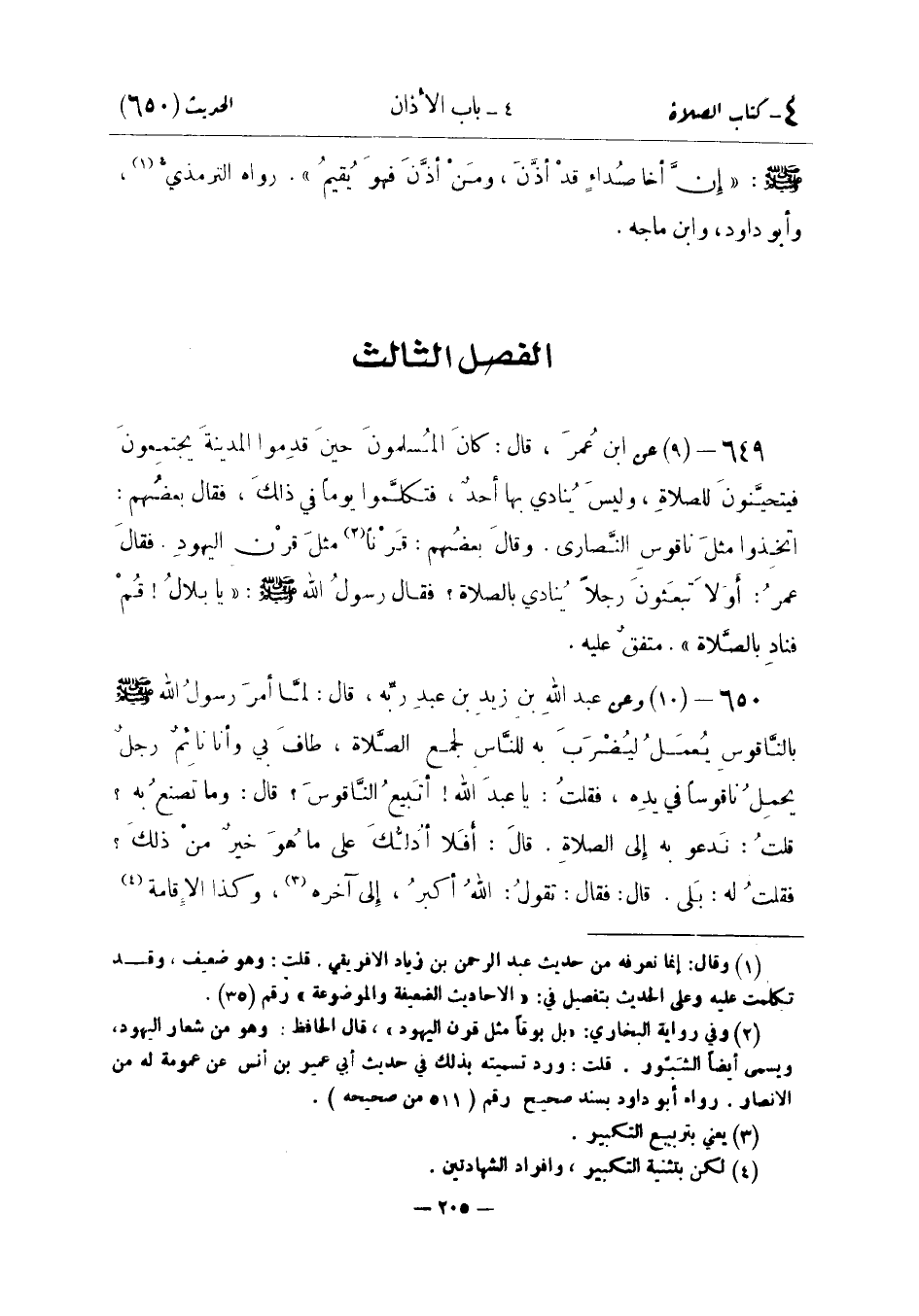 وَعَن عبد الله بن زيد بن عبد ربه قَالَ: لَمَّا أَمَرَ رَسُولُ اللَّهِ صَلَّى اللَّهُ عَلَيْهِ وَسَلَّمَ بِالنَّاقُوسِ يُعْمَلُ لِيُضْرَبَ بِهِ لِلنَّاسِ لِجَمْعِ الصَّلَاةِ طَافَ بِي وَأَنَا نَائِمٌ رَجُلٌ يَحْمِلُ نَاقُوسًا فِي يَدِهِ فَقُلْتُ يَا عَبْدَ اللَّهِ أَتَبِيعُ النَّاقُوسَ قَالَ وَمَا تَصْنَعُ بِهِ فَقلت نَدْعُو بِهِ إِلَى الصَّلَاةِ قَالَ أَفَلَا أَدُلُّكَ عَلَى مَا هُوَ خَيْرٌ مِنْ ذَلِكَ فَقُلْتُ لَهُ بَلَى قَالَ فَقَالَ تَقُولَ اللَّهُ أَكْبَرُ إِلَى آخِرِهِ وَكَذَا الْإِقَامَةُ -[206]- فَلَمَّا أَصْبَحْتُ أَتَيْتُ رَسُولَ اللَّهِ صَلَّى اللَّهُ عَلَيْهِ وَسَلَّمَ فَأَخْبَرْتُهُ بِمَا رَأَيْتُ فَقَالَ: «إِنَّهَا لَرُؤْيَا حَقٍّ إِنْ شَاءَ اللَّهُ فَقُمْ مَعَ بِلَالٍ فَأَلْقِ عَلَيْهِ مَا رَأَيْتَ فَلْيُؤَذِّنْ بِهِ فَإِنَّهُ أَنْدَى صَوْتًا مِنْك» فَقُمْت مَعَ بِلَال فَجعلت ألقيه عَلَيْهِ وَيُؤَذِّنُ بِهِ قَالَ فَسَمِعَ بِذَلِكَ عُمَرُ بْنُ الْخَطَّابِ وَهُوَ فِي بَيْتِهِ فَخَرَجَ يَجُرُّ رِدَاءَهُ وَيَقُول وَالَّذِي بَعَثَكَ بِالْحَقِّ لَقَدْ رَأَيْتُ مِثْلَ مَا أَرَى فَقَالَ رَسُولُ اللَّهِ صَلَّى اللَّهُ عَلَيْهِ وَسَلَّمَ: «فَلِلَّهِ الْحَمْدُ» . رَوَاهُ أَبُو دَاوُدَ وَالدَّارِمِيُّ وَابْنُ مَاجَهْ إِلَّا أَنَّهُ لَمْ يَذْكُرِ الْإِقَامَةَ. وَقَالَ التِّرْمِذِيُّ: هَذَا حَدِيثٌ صَحِيحٌ لَكِنَّهُ لَمْ يُصَرح قصَّة الناقوس
