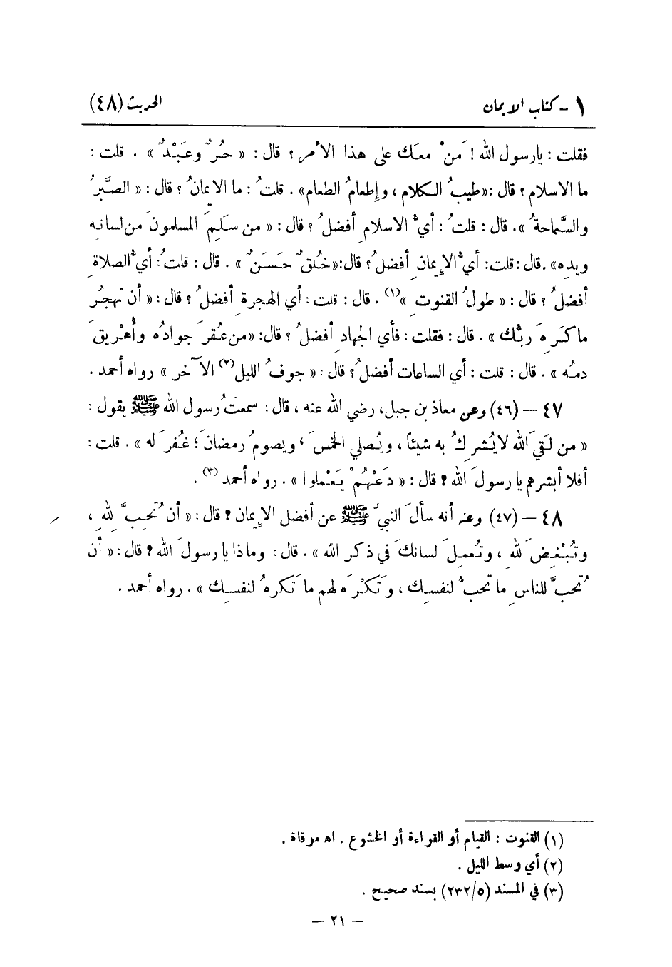 وَعَن معَاذ أَنَّهُ سَأَلَ النَّبِيَّ صَلَّى اللَّهُ عَلَيْهِ وَسَلَّمَ عَنْ أَفْضَلِ الْإِيمَانِ قَالَ: «أَنْ تُحِبَّ لِلَّهِ وَتُبْغِضَ لِلَّهِ وَتُعْمِلَ لِسَانَكَ فِي ذِكْرِ اللَّهِ قَالَ وماذا يَا رَسُول الله قَالَ وَأَن تحب للنَّاس مَا تحب لنَفسك وَتَكْرَهُ لَهُمْ مَا تَكْرَهُ لِنَفْسِكَ» . رَوَاهُ أَحْمَدُ