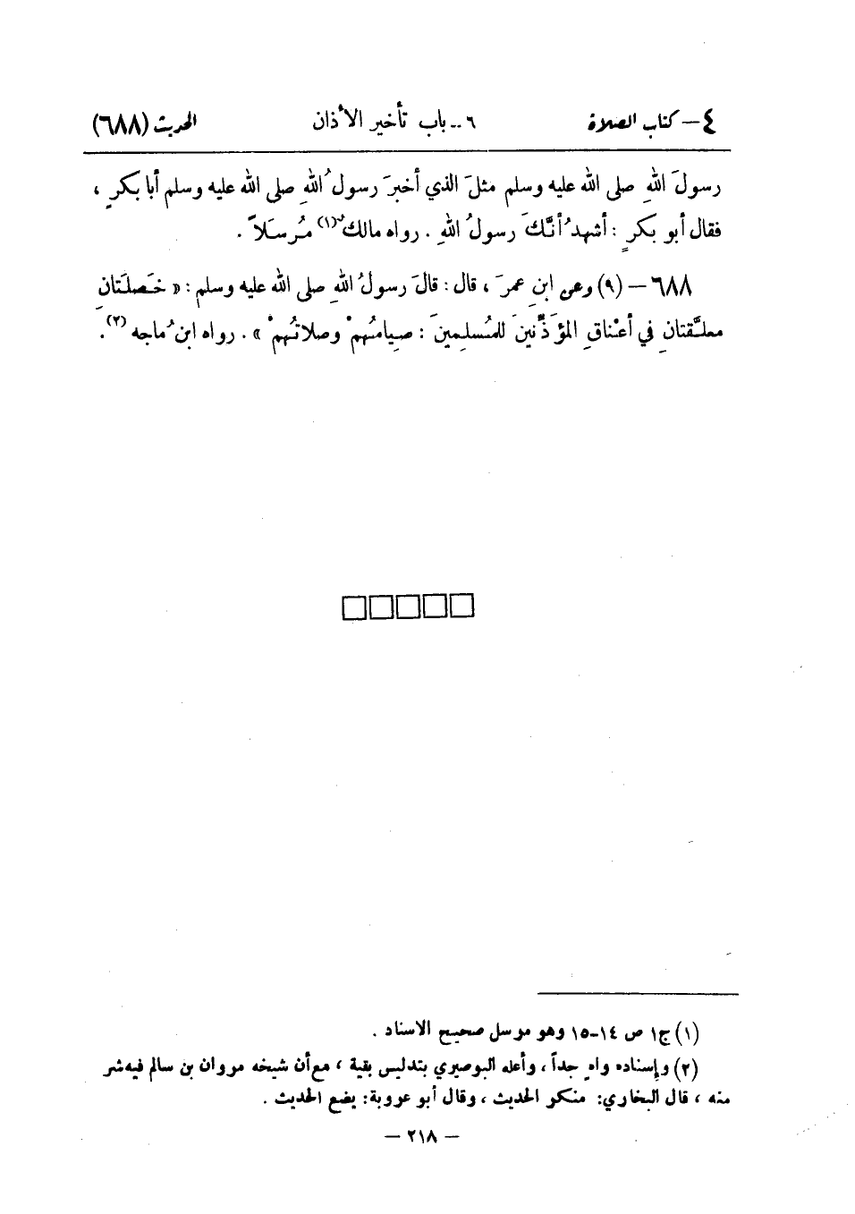 688 -[9] وَعَنِ ابْنِ عُمَرَ قَالَ: قَالَ رَسُولُ اللَّهِ صَلَّى اللَّهُ عَلَيْهِ وَسَلَّمَ: " خَصْلَتَانِ مُعَلَّقَتَانِ فِي أَعْنَاقِ الْمُؤَذِّنِينَ لِلْمُسْلِمِينَ: صِيَامُهُمْ وَصَلَاتُهُمْ ". رَوَاهُ ابْنُ مَاجَهيييييي