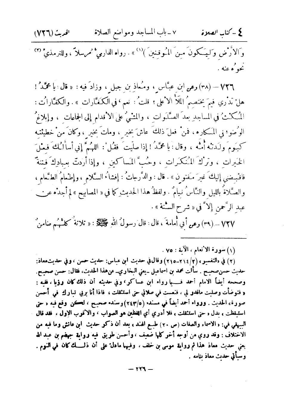 726 -[38] وَعَنِ ابْنِ عَبَّاسٍ وَمُعَاذِ بْنِ جبل وَزَادَ فِيهِ: قَالَ: يَا مُحَمَّدُ {هَلْ تَدْرِي فِيمَ يَخْتَصِمُ الْمَلَأُ الْأَعْلَى؟ قُلْتُ: نَعَمْ فِي الْكَفَّارَاتِ. وَالْكَفَّارَاتُ: الْمُكْثُ فِي الْمَسَاجِدِ بَعْدَ الصَّلَوَاتِ وَالْمَشْيِ عَلَى الْأَقْدَامِ إِلَى الْجَمَاعَاتِ وَإِبْلَاغِ الْوَضُوءِ فِي الْمَكَارِهِ فَمَنْ فَعَلَ ذَلِكَ عَاشَ بِخَيْرٍ وَمَاتَ بِخَيْرٍ وَكَانَ مِنْ خَطِيئَتِهِ كَيَوْمَ وَلَدَتْهُ أُمُّهُ وَقَالَ: يَا مُحَمَّدُ} إِذَا صَلَّيْتَ فَقُلِ: اللَّهُمَّ إِنِّي أَسْأَلُكَ فِعْلَ الْخَيْرَاتِ وَتَرْكَ الْمُنْكَرَاتِ وَحُبَّ الْمَسَاكِينِ وَإِذَا أَرَدْتَ بِعِبَادِكَ فِتْنَةً فَاقْبِضْنِي إِلَيْكَ غَيْرَ مَفْتُونٍ. قَالَ: وَالدَّرَجَاتُ: إِفْشَاءُ السَّلَامِ وَإِطْعَامُ الطَّعَامِ وَالصَّلَاةُ بِاللَّيْلِ وَالنَّاسُ نِيَامٌ. وَلَفْظُ هَذَا الْحَدِيثِ كَمَا فِي الْمَصَابِيحِ لَمْ أَجِدْهُ عَنْ عَبْدِ الرَّحْمَن إِلَّا فِي شرح السّنة.