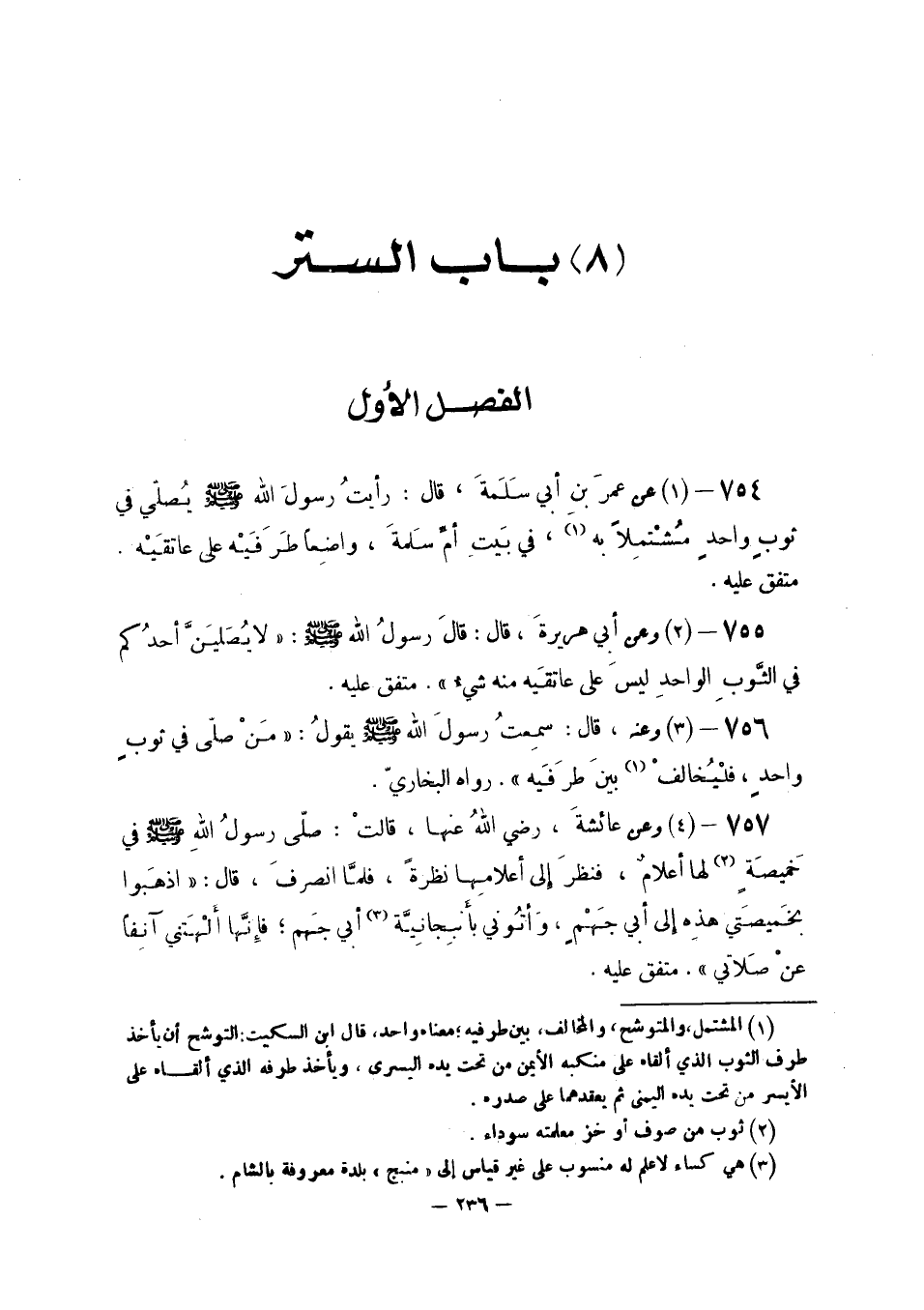 عَن عمر بن أبي سَلمَة قَالَ: رَأَيْتُ رَسُولَ اللَّهِ صَلَّى اللَّهُ عَلَيْهِ وَسَلَّمَ يُصَلِّي فِي ثَوْبٍ وَاحِدٍ مُشْتَمِلًا بِهِ فِي بَيْتِ أُمِّ سَلَمَةَ وَاضِعًا طَرَفَيْهِ عَلَى عَاتِقيهِ