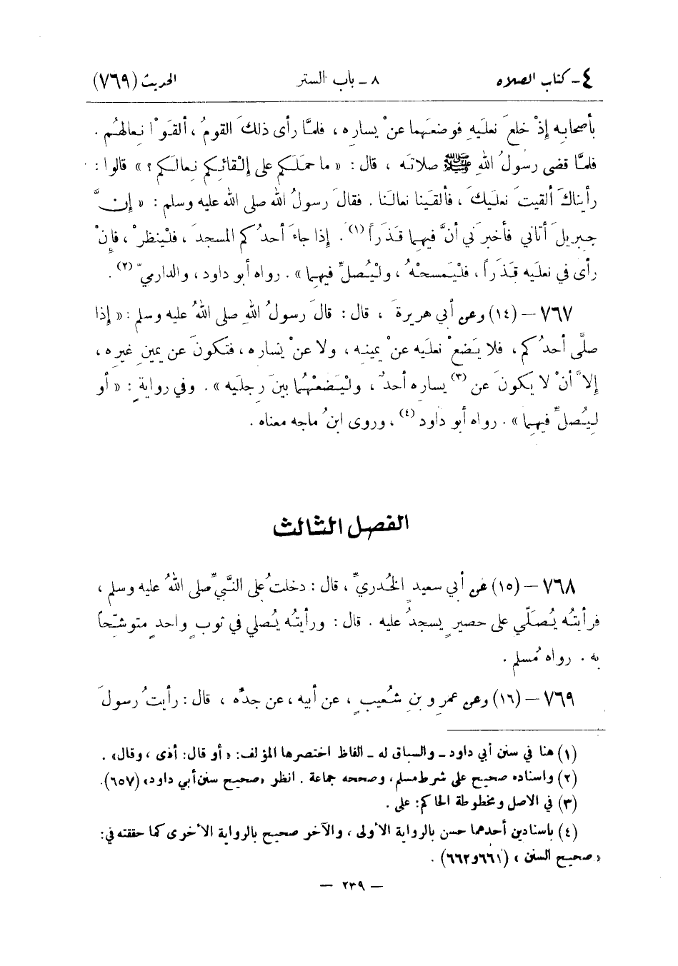 وَعَنْ عَمْرِو بْنِ شُعَيْبٍ عَنْ أَبِيهِ عَنْ جَدِّهِ قَالَ: رَأَيْتُ رَسُولَ -[240]- اللَّهِ صَلَّى اللَّهُ عَلَيْهِ وَسَلَّمَ يُصَلِّي حافيا ومتنعلا. رَوَاهُ أَبُو دَاوُد