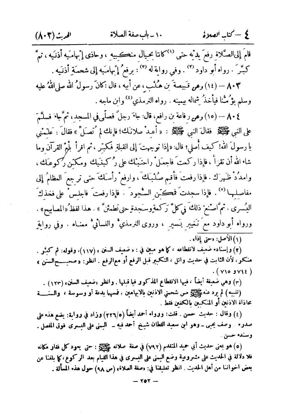 وَعَن رِفَاعَة بن رَافع قَالَ: جَاءَ رَجُلٌ فَصَلَّى فِي الْمَسْجِدِ ثُمَّ جَاءَ فَسَلَّمَ عَلَى النَّبِيِّ صَلَّى اللَّهُ عَلَيْهِ وَسَلَّمَ فَقَالَ النَّبِيُّ صَلَّى اللَّهُ عَلَيْهِ وَسَلَّمَ: «أَعِدْ صَلَاتَكَ فَإِنَّكَ لَمْ تُصَلِّ» . فَقَالَ: عَلِّمْنِي يَا رَسُولَ اللَّهِ كَيْفَ أُصَلِّي؟ قَالَ: «إِذَا تَوَجَّهَتْ إِلَى الْقِبْلَةِ فَكَبِّرْ ثُمَّ اقْرَأْ بِأُمِّ الْقُرْآنِ وَمَا شَاءَ اللَّهُ أَنْ تَقْرَأَ فَإِذَا رَكَعَتْ فَاجْعَلْ رَاحَتَيْكَ عَلَى رُكْبَتَيْكَ وَمَكِّنْ رُكُوعَكَ وَامْدُدْ ظَهْرَكَ فَإِذَا رَفَعْتَ فَأَقِمْ صُلْبَكَ وَارْفَعْ رَأْسَكَ حَتَّى تَرْجِعَ الْعِظَامُ إِلَى مَفَاصِلِهَا فَإِذَا سَجَدْتَ فَمَكِّنِ السُّجُودَ فَإِذَا رَفَعْتَ فَاجْلِسْ عَلَى فَخِذِكَ الْيُسْرَى ثُمَّ اصْنَعْ ذَلِكَ فِي كُلِّ رَكْعَةٍ وَسَجْدَةٍ حَتَّى تَطْمَئِنَّ. هَذَا لَفَظُ» الْمَصَابِيحِ ". وَرَوَاهُ أَبُو دَاوُدُ مَعَ تَغْيِيرٍ يَسِيرٍ وَرَوَى التِّرْمِذِيُّ وَالنَّسَائِيُّ مَعْنَاهُ. وَفِي رِوَايَةٍ -[253]- لِلتِّرْمِذِيِّ قَالَ: «إِذَا قُمْتَ إِلَى الصَّلَاةِ فَتَوَضَّأْ كَمَا أَمَرَكَ اللَّهُ بِهِ ثُمَّ تَشَهَّدْ فَأَقِمْ فَإِنْ كَانَ مَعَكَ قُرْآنٌ فَاقْرَأْ وَإِلَّا فَاحْمَدِ اللَّهَ وَكَبِّرْهُ وَهَلله ثمَّ اركع»