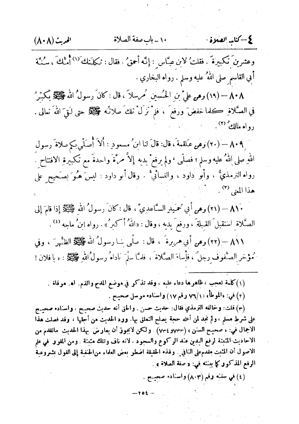 وَعَنْ عَلْقَمَةَ قَالَ: قَالَ لَنَا ابْنُ مَسْعُودٍ: أَلا أُصَلِّي بكم صَلَاة رَسُولِ اللَّهِ صَلَّى اللَّهُ عَلَيْهِ وَسَلَّمَ؟ فَصَلَّى وَلَمْ يَرْفَعْ يَدَيْهِ إِلَّا مَرَّةً وَاحِدَةً مَعَ تَكْبِيرَةِ الِافْتِتَاحِ. رَوَاهُ التِّرْمِذِيُّ وَأَبُو دَاوُدَ وَالنَّسَائِيُّ. وَقَالَ أَبُو دَاوُدَ: لَيْسَ هُوَ بِصَحِيح على هَذَا الْمَعْنى