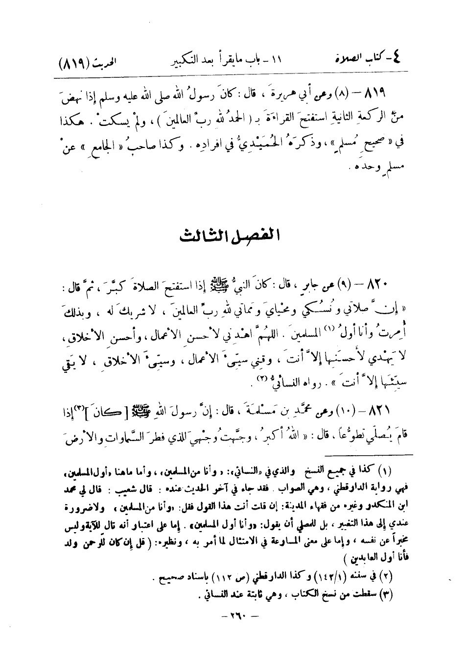عَنْ جَابِرِ بْنِ عَبْدِ اللَّهِ قَالَ: كَانَ النَّبِيُّ صَلَّى اللَّهُ عَلَيْهِ وَسَلَّمَ إِذَا اسْتَفْتَحَ الصَّلَاةَ كَبَّرَ ثُمَّ قَالَ: «إِنَّ صَلَاتِي وَنُسُكِي وَمَحْيَايَ وَمَمَاتِي لِلَّهِ رَبِّ الْعَالَمِينَ لَا شَرِيكَ لَهُ وَبِذَلِكَ أَمَرْتُ وَأَنَا مِنَ الْمُسلمين اللَّهُمَّ اهدني لِأَحْسَنِ الْأَعْمَالِ وَأَحْسَنِ الْأَخْلَاقِ لَا يَهْدِي لِأَحْسَنِهَا إِلَّا أَنْتَ وَقِنِي سَيِّئَ الْأَعْمَالِ وَسَيِّئَ الْأَخْلَاقِ لَا يَقِي سَيِّئَهَا إِلَّا أَنْتَ» . رَوَاهُ النَّسَائِيُّ