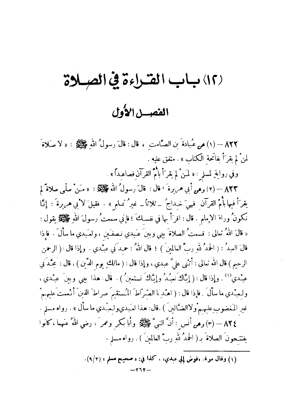 عَنْ عُبَادَةَ بْنِ الصَّامِتِ قَالَ: قَالَ رَسُولُ اللَّهِ صَلَّى اللَّهُ عَلَيْهِ وَسَلَّمَ: «لَا صَلَاةَ لمن لم يقْرَأ بِفَاتِحَة الْكتاب»