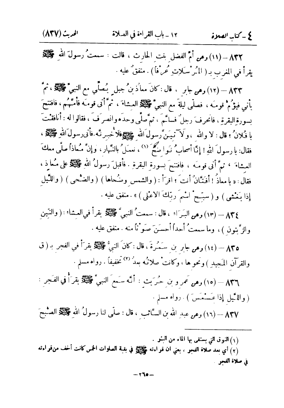 وَعَنْ جَابِرٍ قَالَ: كَانَ مُعَاذُ يُصَلِّي مَعَ النَّبِيِّ صَلَّى اللَّهُ عَلَيْهِ وَسَلَّمَ ثُمَّ يَأْتِي فَيَؤُمُّ قَوْمَهُ فَصَلَّى لَيْلَةً مَعَ النَّبِيِّ صَلَّى اللَّهُ عَلَيْهِ وَسَلَّمَ الْعِشَاءَ ثُمَّ أَتَى قَوْمَهُ فَأَمَّهُمْ فَافْتَتَحَ بِسُورَةِ الْبَقَرَةِ فَانْحَرَفَ رَجُلٌ فَسَلَّمَ ثُمَّ صَلَّى وَحْدَهُ وَانْصَرَفَ فَقَالُوا لَهُ أَنَافَقَتْ يَا فُلَانُ قَالَ لَا وَاللَّهِ وَلَآتِيَنَّ رَسُولَ اللَّهِ صَلَّى اللَّهُ عَلَيْهِ وَسَلَّمَ فلأخبرنه فَأَتَى رَسُولَ اللَّهِ صَلَّى اللَّهُ عَلَيْهِ وَسَلَّمَ فَقَالَ يَا رَسُولَ اللَّهِ إِنَّا أَصْحَابُ نَوَاضِحَ نَعْمَلُ بِالنَّهَارِ وَإِنَّ مُعَاذًا صَلَّى مَعَكَ الْعِشَاءَ ثُمَّ أَتَى قَوْمَهُ فَافْتَتَحَ بِسُورَةِ الْبَقَرَةِ فَأَقْبَلَ رَسُولِ اللَّهِ صَلَّى اللَّهُ عَلَيْهِ وَسَلَّمَ عَلَى مُعَاذٍ فَقَالَ: " يَا مُعَاذُ أَفَتَّانٌ؟ أَنْتَ اقْرَأ: (الشَّمْس وَضُحَاهَا " (وَالضُّحَى)