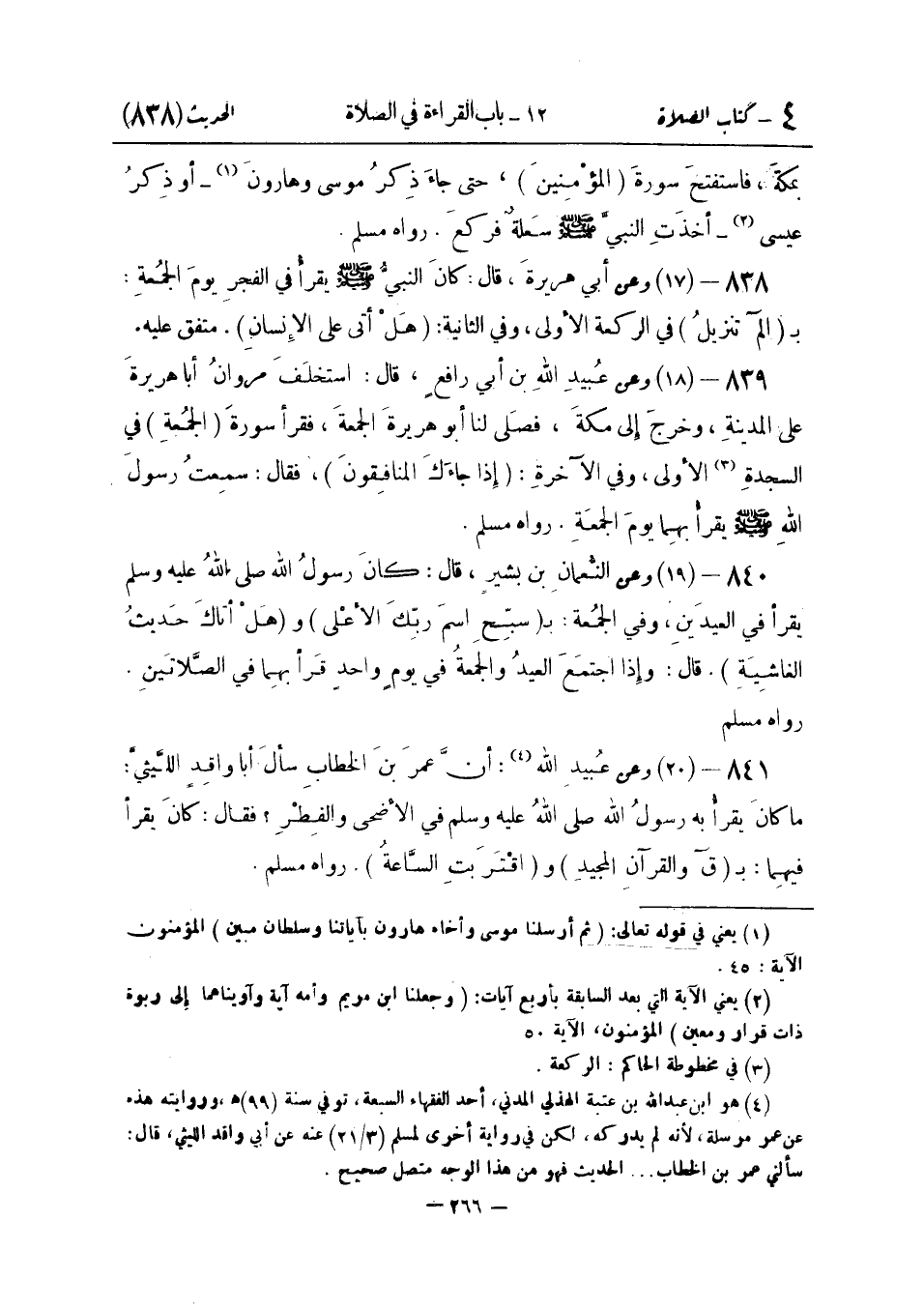 وَعَنْ عُبَيْدِ اللَّهِ: أَنَّ عُمَرَ بْنَ الْخَطَّابِ سَأَلَ أَبَا وَاقِدٍ اللَّيْثِيَّ: (مَا كَانَ يَقْرَأُ بِهِ رَسُولُ اللَّهِ صَلَّى اللَّهُ عَلَيْهِ وَسَلَّمَ فِي الْأَضْحَى وَالْفِطْرِ؟ فَقَالَ: كَانَ يَقْرَأُ فِيهِمَا: ب (ق وَالْقُرْآن الْمجِيد)