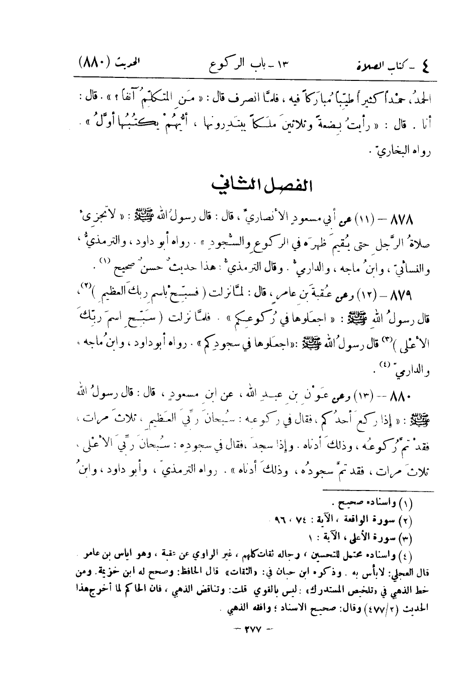 عَنْ أَبِي مَسْعُودِ الْأَنْصَارِيِّ قَالَ: قَالَ رَسُولُ اللَّهِ صَلَّى اللَّهُ عَلَيْهِ وَسَلَّمَ: «لَا تُجْزِئُ صَلَاةُ الرَّجُلِ حَتَّى يُقِيمَ ظَهْرَهُ فِي الرُّكُوعِ وَالسُّجُودِ» . رَوَاهُ أَبُو دَاوُدَ وَالتِّرْمِذِيُّ وَالنَّسَائِيُّ وَابْنُ مَاجَهْ وَالدَّارِمِيُّ وَقَالَ التِّرْمِذِيُّ: هَذَا حَدِيثٌ حَسَنٌ صَحِيحٌ