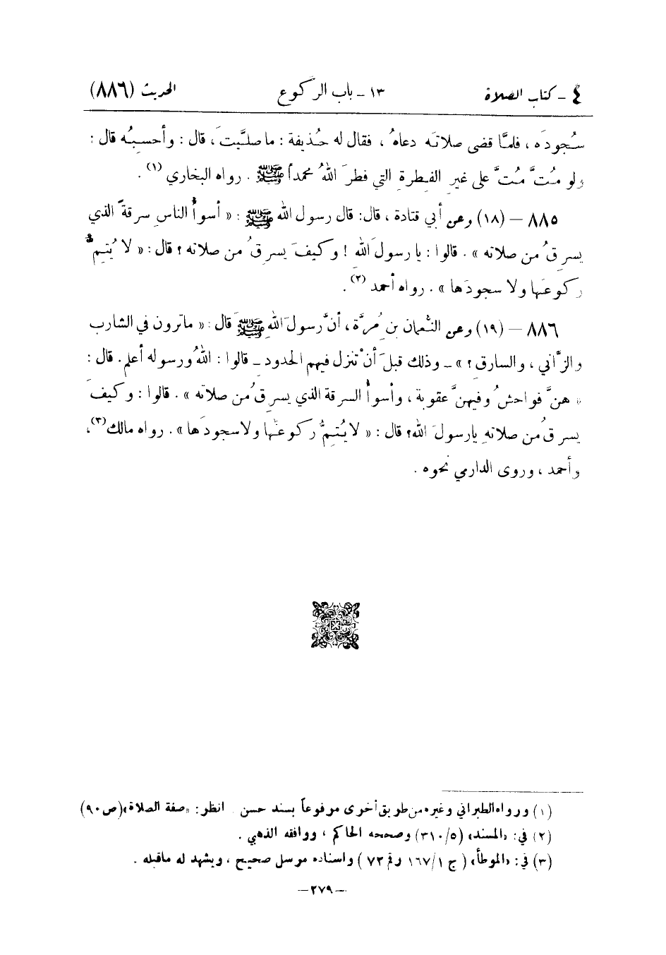 وَعَن النُّعْمَان بن مرّة أَنَّ رَسُولَ اللَّهِ صَلَّى اللَّهُ عَلَيْهِ وَسَلَّمَ قَالَ: مَا تَرَوْنَ فِي الشَّارِبِ وَالزَّانِي وَالسَّارِقِ؟ " وَذَلِكَ قَبْلَ أَنْ تُنْزَلَ فِيهِمُ الْحُدُودُ قَالُوا: اللَّهُ وَرَسُولُهُ أَعْلَمُ. قَالَ: «هُنَّ فَوَاحِشُ وَفِيهِنَّ عُقُوبَةٌ وَأَسْوَأُ السَّرِقَةِ الَّذِي يَسْرِقُ مِنْ صَلَاتِهِ» . قَالُوا: وَكَيف يسرق م صَلَاتِهِ يَا رَسُولَ اللَّهِ؟ قَالَ: «لَا يُتِمُّ ركوعها وَلَا سجودها» . رَوَاهُ مَالك وَأحمد وروى الدَّارمِيّ نَحوه