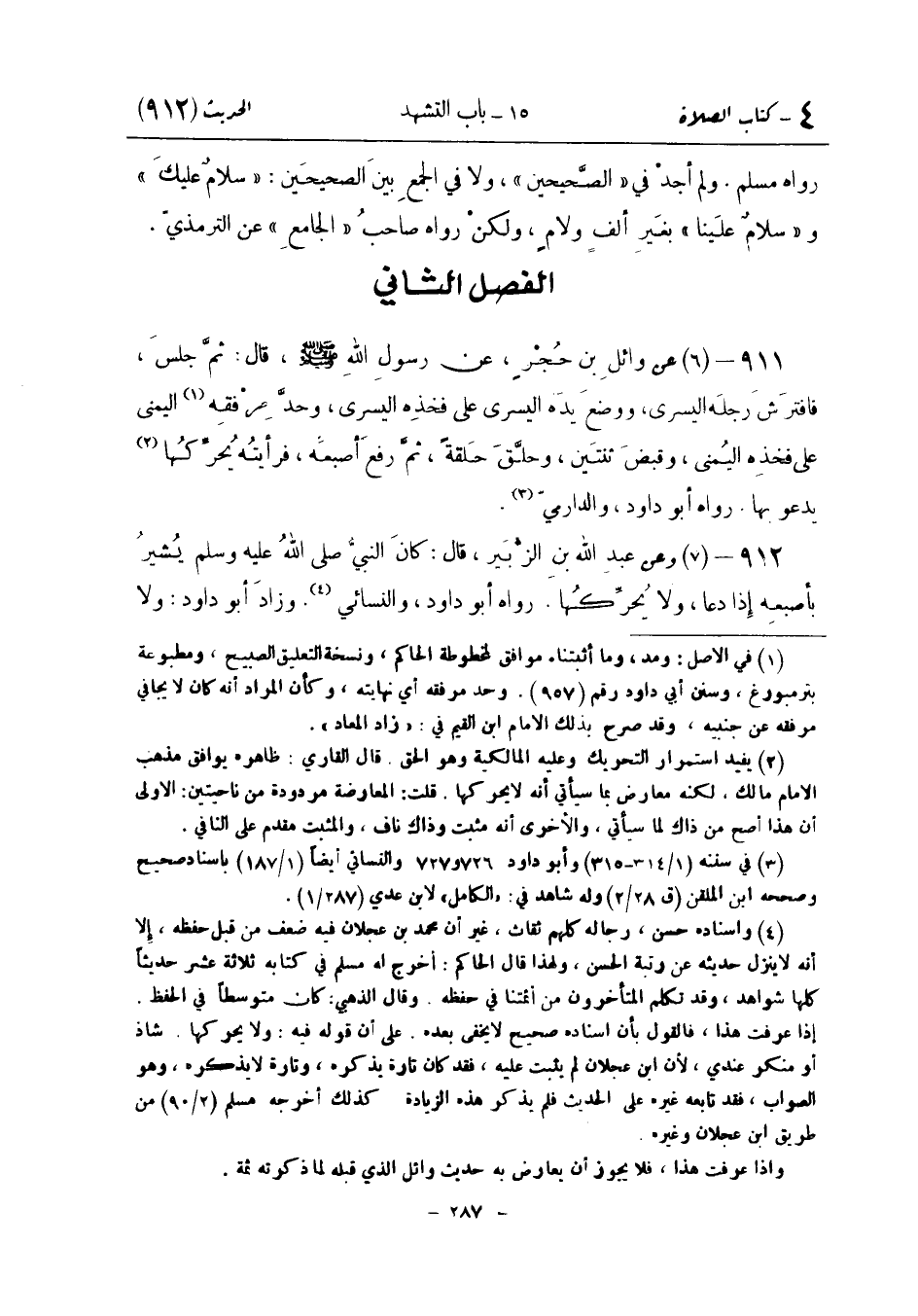 وَعَن وَائِلِ بْنِ حَجَرٍ عَنْ رَسُولِ اللَّهِ صَلَّى اللَّهُ عَلَيْهِ وَسَلَّمَ قَالَ: ثُمَّ جَلَسَ فَافْتَرَشَ رِجْلَهُ الْيُسْرَى وَوَضَعَ يَدَهُ الْيُسْرَى عَلَى فَخِذِهِ الْيُسْرَى وَحَدَّ مِرْفَقَهُ الْيُمْنَى عَلَى فَخِذِهِ الْيُمْنَى وَقَبَضَ ثِنْتَيْنِ وَحَلَّقَ حَلْقَةً ثُمَّ رَفَعَ أُصْبُعَهُ فَرَأَيْتُهُ يُحَرِّكُهَا يَدْعُو بهَا. رَوَاهُ أَبُو دَاوُد والدارمي