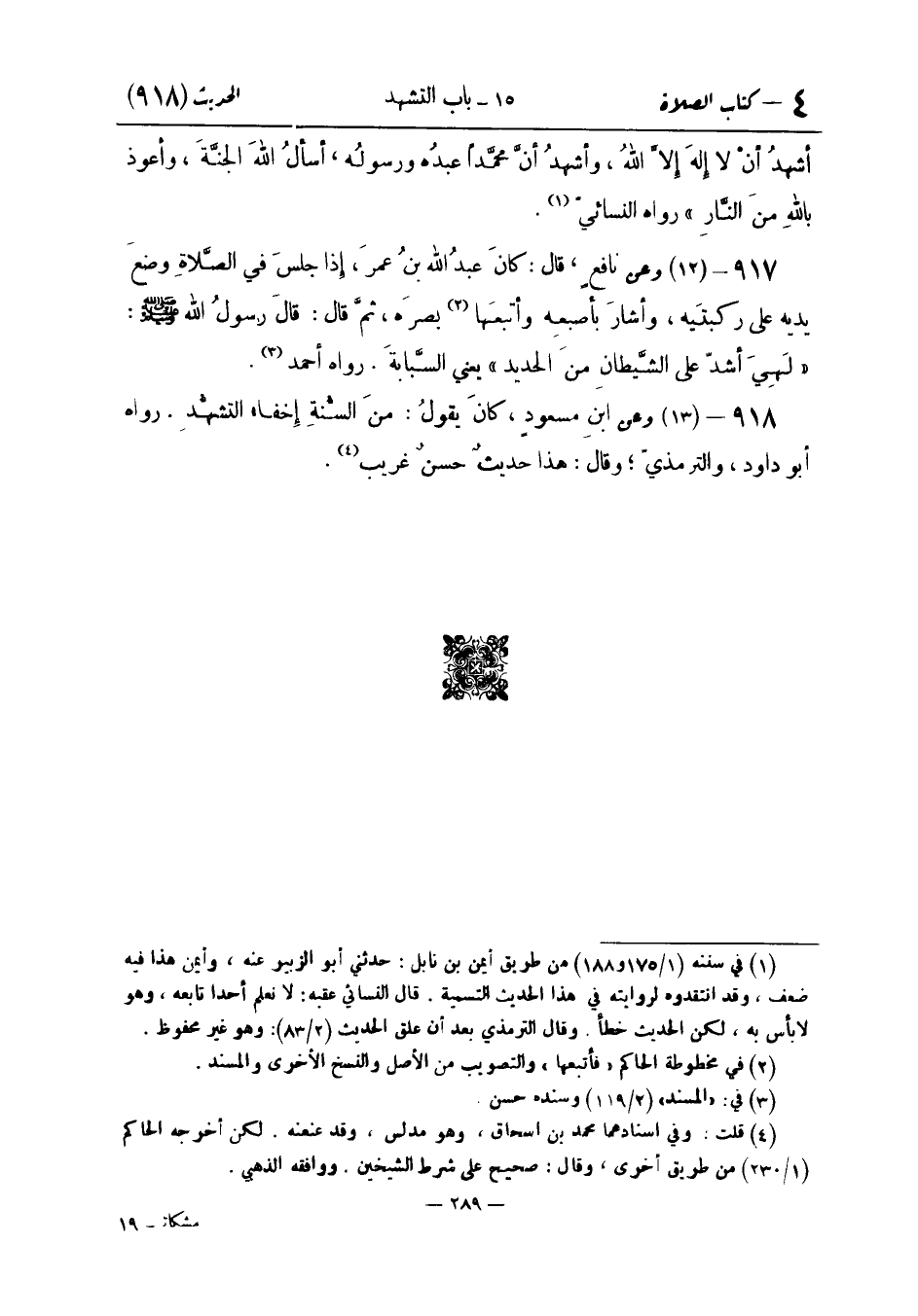 وَعَنِ ابْنِ مَسْعُودٍ كَانَ يَقُولُ: مِنَ السُّنَّةِ إِخْفَاءُ التَّشَهُّدِ. رَوَاهُ أَبُو دَاوُدَ وَالتِّرْمِذِيُّ وَقَالَ: هَذَا حَدِيثٌ حَسَنٌ غَرِيبٌ