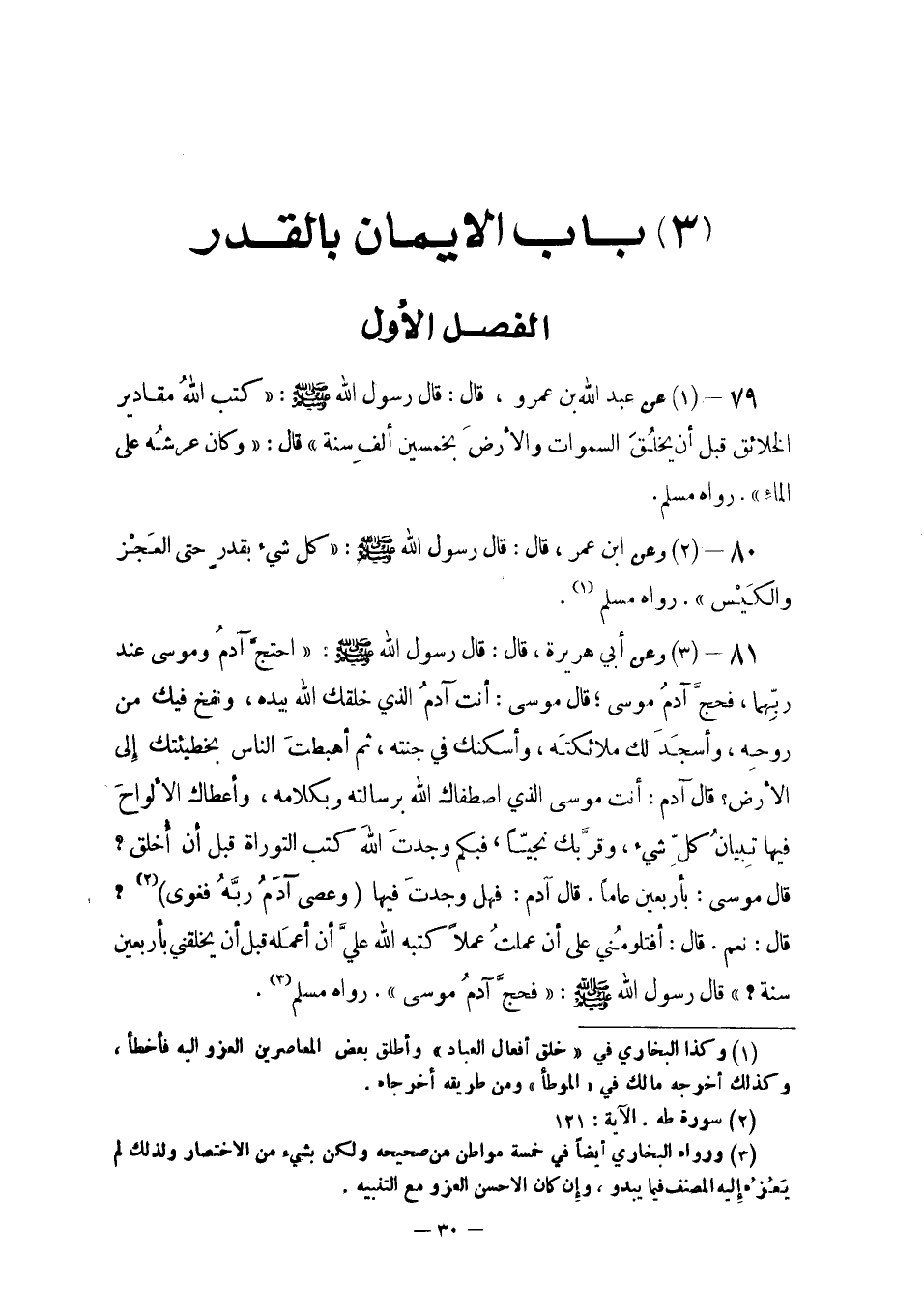 عَنْ أَبِي هُرَيْرَةَ قَالَ قَالَ رَسُولُ اللَّهِ صَلَّى اللَّهُ عَلَيْهِ وَسَلَّمَ: «احْتَجَّ آدَمُ وَمُوسَى عَلَيْهِمَا السَّلَام عِنْدَ رَبِّهِمَا فَحَجَّ آدَمُ مُوسَى قَالَ مُوسَى أَنْتَ آدَمُ الَّذِي خَلَقَكَ اللَّهُ بِيَدِهِ وَنَفَخَ فِيكَ مِنْ رُوحِهِ وَأَسْجَدَ لَكَ مَلَائِكَتَهُ وَأَسْكَنَكَ فِي جَنَّتِهِ ثُمَّ أَهَبَطْتَ النَّاسَ بِخَطِيئَتِكَ إِلَى الأَرْض فَقَالَ آدَمُ أَنْتَ مُوسَى الَّذِي اصْطَفَاكَ اللَّهُ بِرِسَالَتِهِ وَبِكَلَامِهِ وَأَعْطَاكَ الْأَلْوَاحَ فِيهَا تِبْيَانُ كُلِّ شَيْءٍ وَقَرَّبَكَ نَجِيًّا فَبِكَمْ وَجَدَتِ اللَّهِ كَتَبَ التَّوْرَاةَ قَبْلَ أَنْ أُخْلَقَ قَالَ مُوسَى بِأَرْبَعِينَ عَامًا قَالَ آدَمُ فَهَلْ وَجَدْتَ فِيهَا (وَعَصَى آدَمُ ربه فغوى)