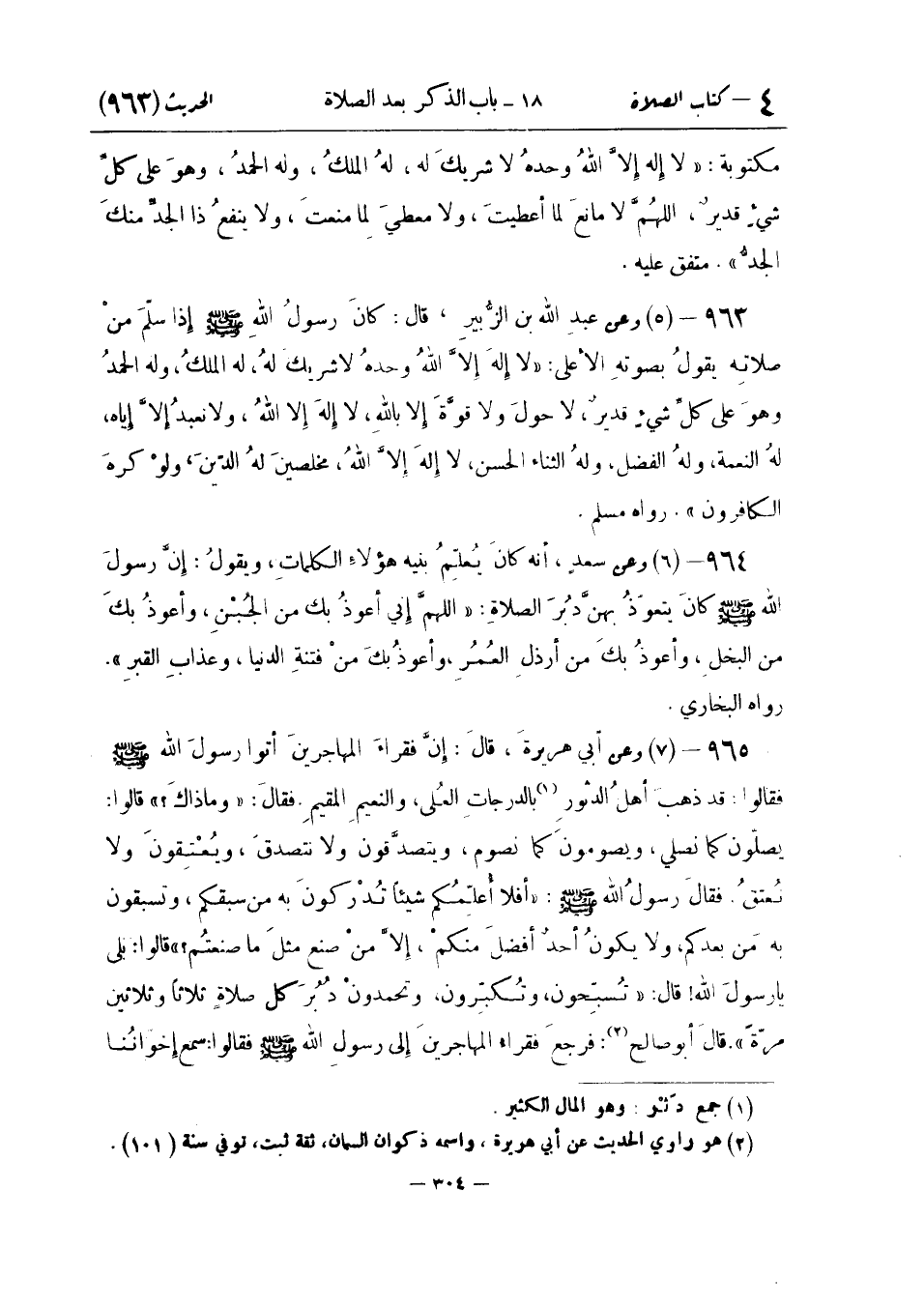 وَعَنْ أَبِي هُرَيْرَةَ قَالَ: (إِنَّ فُقَرَاءَ الْمُهَاجِرِينَ أَتَوْا رَسُولَ اللَّهِ صَلَّى اللَّهُ عَلَيْهِ وَسَلَّمَ فَقَالُوا: قَدْ ذَهَبَ أَهْلُ الدُّثُورِ بِالدَّرَجَاتِ الْعُلَى وَالنَّعِيمِ الْمُقِيمِ فَقَالَ وَمَا ذَاكَ قَالُوا يُصَلُّونَ كَمَا نُصَلِّي وَيَصُومُونَ كَمَا نَصُومُ وَيَتَصَدَّقُونَ وَلَا نَتَصَدَّقُ وَيُعْتِقُونَ وَلَا نُعْتِقُ فَقَالَ رَسُولُ اللَّهِ صَلَّى اللَّهُ عَلَيْهِ وَسَلَّمَ: «أَفَلَا أُعَلِّمُكُمْ شَيْئًا تُدْرِكُونَ بِهِ مَنْ سَبَقَكُمْ وَتَسْبِقُونَ بِهِ مَنْ بَعْدَكُمْ وَلَا يَكُونُ أَحَدٌ أَفْضَلَ مِنْكُمْ إِلَّا مَنْ صَنَعَ مِثْلَ مَا صَنَعْتُمْ» قَالُوا بَلَى يَا رَسُولَ اللَّهِ قَالَ: «تُسَبِّحُونَ وَتُكَبِّرُونَ وَتَحْمَدُونَ دُبُرَ كُلِّ صَلَاةٍ ثَلَاثًا وَثَلَاثِينَ مَرَّةً» . قَالَ أَبُو صَالِحٍ: فَرَجَعَ فُقَرَاءُ الْمُهَاجِرِينَ إِلَى رَسُولِ اللَّهِ صَلَّى اللَّهُ عَلَيْهِ وَسَلَّمَ فَقَالُوا سَمِعَ إِخْوَانُنَا -[305]- أَهْلُ الْأَمْوَالِ بِمَا فَعَلْنَا فَفَعَلُوا مِثْلَهُ فَقَالَ رَسُولُ اللَّهِ صَلَّى اللَّهُ عَلَيْهِ وَسَلَّمَ: «ذَلِك فضل الله يؤته من يَشَاء» . وَلَيْسَ قَوْلُ أَبِي صَالِحٍ إِلَى آخِرِهِ إِلَّا عِنْدَ مُسْلِمٍ وَفِي رِوَايَةٍ لِلْبُخَارِيِّ: «تُسَبِّحُونَ فِي دُبُرَ كُلِّ صَلَاةٍ عَشْرًا وَتَحْمَدُونَ عَشْرًا وَتُكَبِّرُونَ عشرا» . بدل ثَلَاثًا وَثَلَاثِينَ