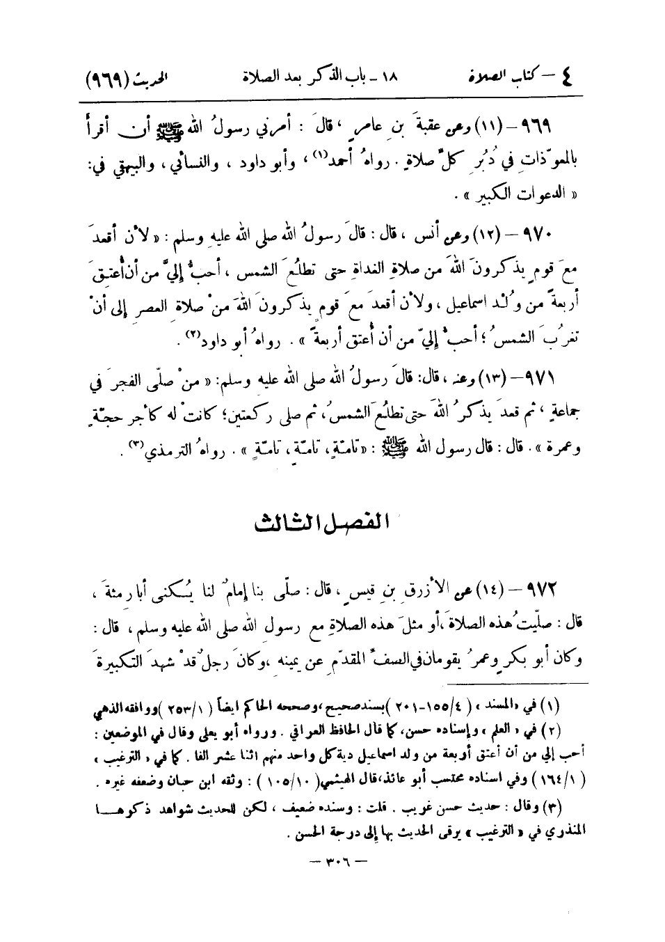 وَعَنْ عُقْبَةَ بْنِ عَامِرٍ قَالَ: أَمَرَنِي رَسُولُ اللَّهِ صَلَّى اللَّهُ عَلَيْهِ وَسَلَّمَ أَنْ أَقْرَأَ بِالْمُعَوِّذَاتِ فِي دُبُرِ كُلِّ صَلَاةٍ. رَوَاهُ احْمَدُ وَأَبُو دَاوُدَ وَالنَّسَائِيُّ وَالْبَيْهَقِيُّ فِي الدَّعَوَاتِ الْكَبِيرِ