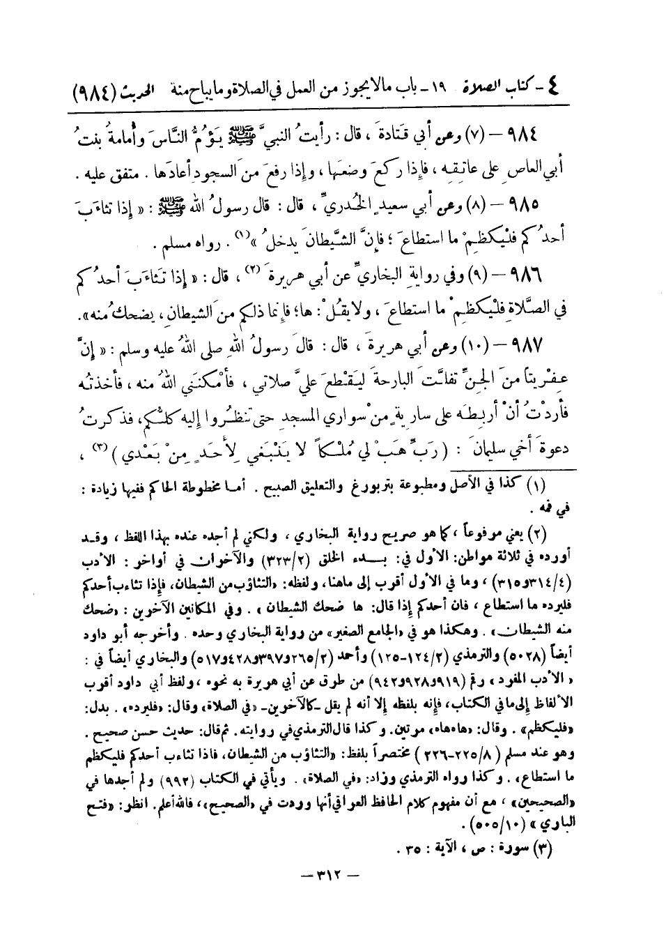 وَعَنْ أَبِي هُرَيْرَةَ رَضِيَ اللَّهُ عَنْهُ قَالَ: قَالَ رَسُولُ اللَّهِ صَلَّى اللَّهُ عَلَيْهِ وَسَلَّمَ: " إِنَّ عِفْرِيتًا مِنَ الْجِنِّ تَفَلَّتَ الْبَارِحَةَ لِيَقْطَعَ عَلَيَّ صَلَاتِي فَأَمْكَنَنِي اللَّهُ مِنْهُ فَأَخَذْتُهُ فَأَرَدْتُ أَنْ أَرْبِطَهُ عَلَى سَارِيَةٍ مِنْ سَوَارِي الْمَسْجِدِ حَتَّى تَنْظُرُوا إِلَيْهِ كُلُّكُمْ فَذَكَرْتُ دَعْوَةَ أَخِي سُلَيْمَانَ: (رَبِّ هَبْ لِي مُلْكًا لَا يَنْبَغِي لِأَحَدٍ مِنْ بَعْدِي) -[313]-