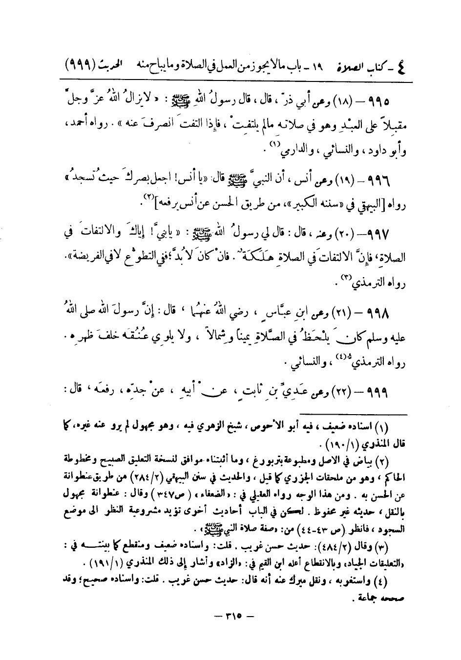 وَعَنِ ابْنِ عَبَّاسٍ رَضِيَ اللَّهُ عَنْهُمَا قَالَ: إِنَّ رَسُولَ اللَّهِ صَلَّى اللَّهُ عَلَيْهِ وَسَلَّمَ كَانَ يَلْحَظُ فِي الصَّلَاةِ يَمِينًا وَشِمَالًا وَلَا يَلْوِي عُنُقَهُ خَلْفَ ظَهْرِهِ. رَوَاهُ التِّرْمِذِيُّ وَالنَّسَائِيُّ