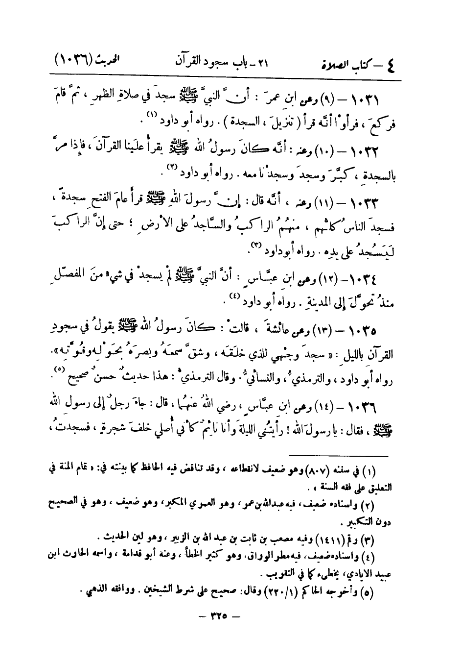 وَعَنِ ابْنِ عُمَرَ: أَنَّ النَّبِيَّ صَلَّى اللَّهُ عَلَيْهِ وَسَلَّمَ سَجَدَ فِي صَلَاةِ الظُّهْرِ ثُمَّ قَامَ فَرَكَعَ فَرَأَوْا أَنَّهُ قَرَأَ تَنْزِيلَ السَّجْدَةَ. رَوَاهُ أَبُو دَاوُد