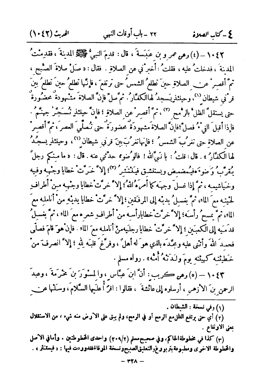 وَعَن عَمْرو بن عبسة قَالَ: قَدِمَ النَّبِيُّ صَلَّى اللَّهُ عَلَيْهِ وَسَلَّمَ الْمَدِينَةَ فَقَدِمْتُ الْمَدِينَةَ فَدَخَلْتُ عَلَيْهِ فَقُلْتُ: أَخْبِرْنِي عَنِ الصَّلَاةِ فَقَالَ: «صَلِّ صَلَاةَ الصُّبْحِ ثُمَّ أقصر عَن الصَّلَاة حَتَّى تَطْلُعُ الشَّمْسُ حَتَّى تَرْتَفِعَ فَإِنَّهَا تَطْلُعُ حِينَ تَطْلَعُ بَيْنَ قَرْنَيْ شَيْطَانٍ وَحِينَئِذٍ يَسْجُدُ لَهَا الْكُفَّارُ ثُمَّ صَلِّ فَإِنَّ الصَّلَاةَ مَشْهُودَةٌ مَحْضُورَةٌ حَتَّى يَسْتَقِلَّ الظِّلُّ بِالرُّمْحِ ثُمَّ أَقْصِرْ عَنِ الصَّلَاةِ فَإِنَّ حِينَئِذٍ تُسْجَرُ جَهَنَّمُ فَإِذَا أَقْبَلَ الْفَيْءُ فَصَلِّ فَإِنَّ الصَّلَاةَ مَشْهُودَةٌ مَحْضُورَةٌ حَتَّى تُصَلِّيَ الْعَصْرَ ثُمَّ أَقْصِرْ عَنِ الصَّلَاةِ حَتَّى تَغْرُبَ الشَّمْسُ فَإِنَّهَا تَغْرُبُ بَيْنَ قَرْنَيْ شَيْطَانٍ وَحِينَئِذٍ يسْجد لَهَا الْكفَّار» قَالَ فَقلت يَا نَبِيَّ اللَّهِ فَالْوُضُوءُ حَدِّثْنِي عَنْهُ قَالَ: «مَا مِنْكُم رجل يقرب وضوءه فيتمضمض ويستنشق فينتثر إِلَّا خَرَّتْ خَطَايَا وَجْهِهِ وَفِيهِ وَخَيَاشِيمِهِ ثُمَّ إِذَا غَسَلَ وَجْهَهُ كَمَا أَمَرَهُ اللَّهُ إِلَّا خَرَّتْ خَطَايَا وَجْهِهِ مِنْ أَطْرَافِ لِحْيَتِهِ مَعَ الْمَاءِ ثُمَّ يَغْسِلُ يَدَيْهِ إِلَى الْمِرْفَقَيْنِ إِلَّا خَرَّتْ خَطَايَا يَدَيْهِ مِنْ أَنَامِلِهِ مَعَ الْمَاءِ ثُمَّ يَمْسَحُ رَأْسَهُ إِلَّا خَرَّتْ خَطَايَا رَأْسِهِ مِنْ أَطْرَافِ شَعْرِهِ مَعَ الْمَاءِ ثُمَّ يَغْسِلُ قَدَمَيْهِ إِلَى الْكَعْبَيْنِ إِلَّا خَرَّتْ خَطَايَا رِجْلَيِهِ مِنْ أَنَامِلِهِ مَعَ الْمَاءِ فَإِنْ هُوَ قَامَ فَصَلَّى فَحَمِدَ اللَّهَ وَأَثْنَى عَلَيْهِ وَمَجَّدَهُ بِالَّذِي هُوَ لَهُ أَهْلٌ وَفَرَّغَ قَلْبَهُ لِلَّهِ إِلَّا انْصَرَفَ مِنْ خَطِيئَتِهِ كَهَيْئَتِهِ يَوْمَ وَلَدَتْهُ أُمُّهُ» . رَوَاهُ مُسلم