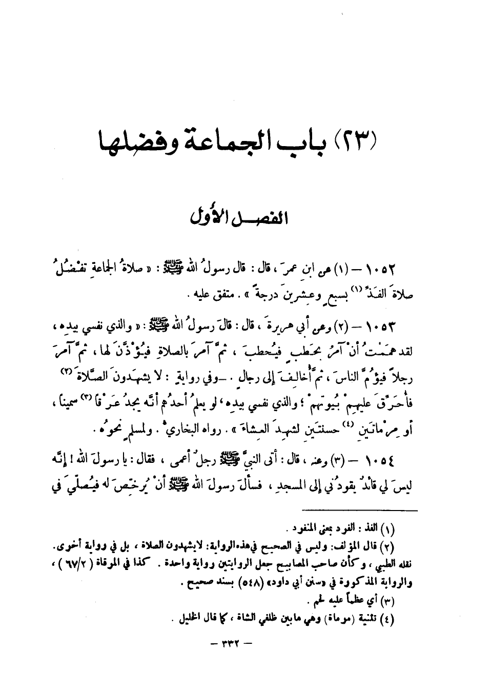 عَنِ ابْنِ عُمَرَ قَالَ: قَالَ رَسُولُ اللَّهِ صَلَّى اللَّهُ عَلَيْهِ وَسَلَّمَ: «صَلَاةُ الْجَمَاعَةِ تَفْضُلُ صَلَاة الْفَذ بِسبع وَعشْرين دَرَجَة»