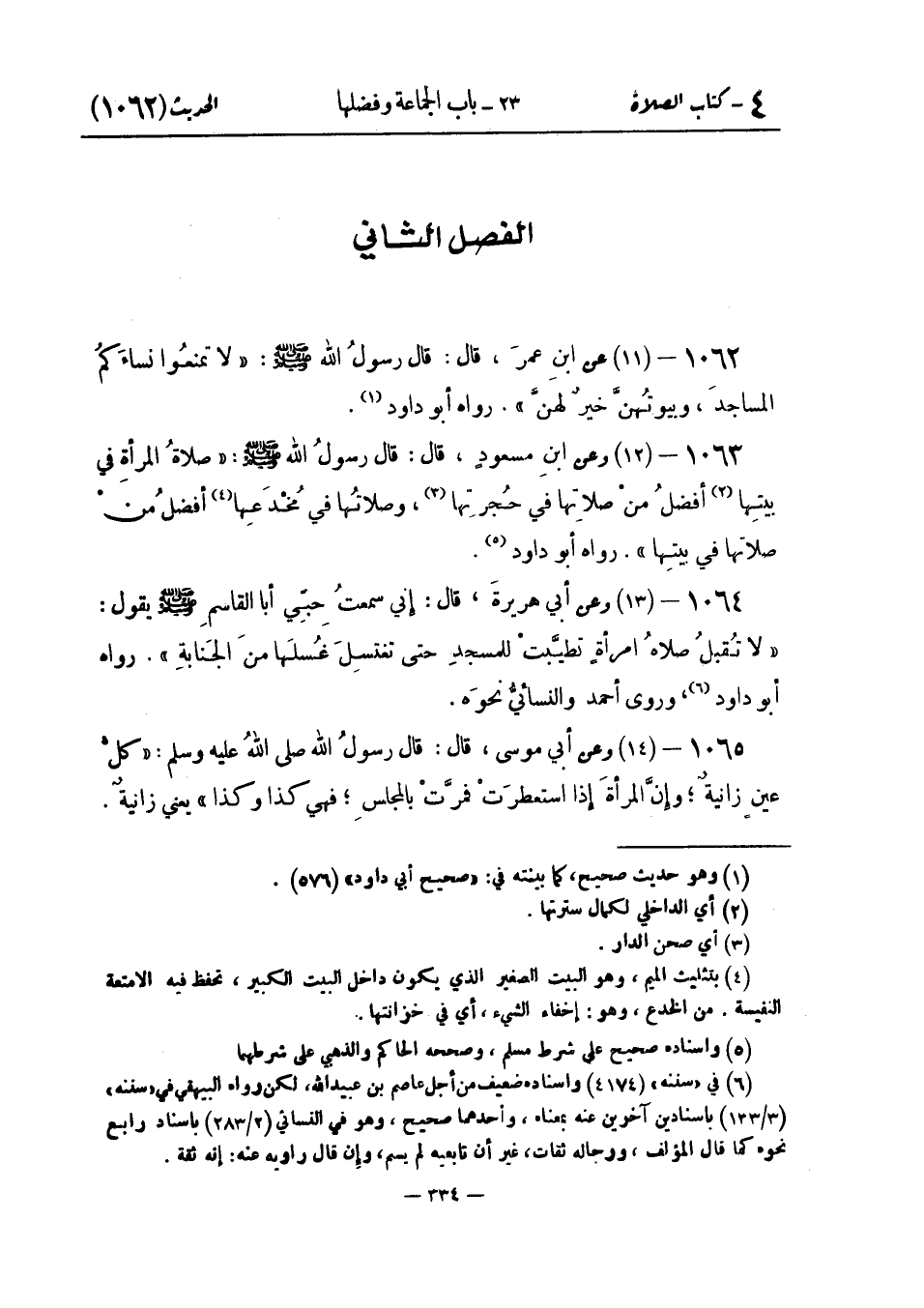 وَعَنِ ابْنِ مَسْعُودٍ قَالَ: قَالَ رَسُولُ اللَّهِ صَلَّى اللَّهُ عَلَيْهِ وَسَلَّمَ: «صَلَاةُ الْمَرْأَةِ فِي بَيْتِهَا أَفْضَلُ مِنْ صَلَاتِهَا فِي حُجْرَتِهَا وَصَلَاتُهَا فِي مَخْدَعِهَا أَفْضَلُ مِنْ صَلَاتِهَا فِي بَيْتِهَا» . رَوَاهُ أَبُو دَاوُد